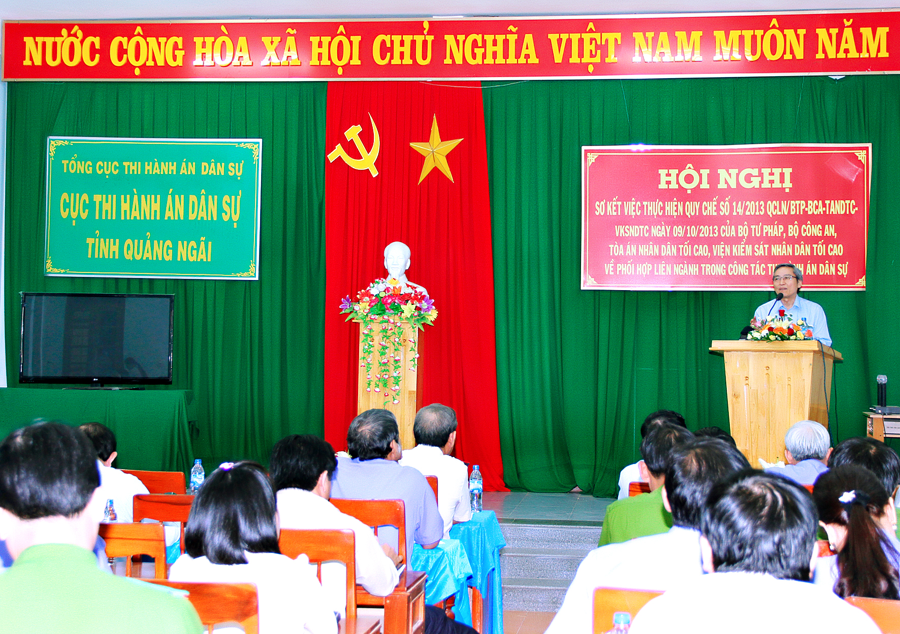 Thực hiện Kế hoạch tổ chức sơ kết việc thực hiện Quy chế số 14/2013/QCLN/BTP-BCA-TANDTC-VKSNDTC ngày 09/10/2013 của Bộ Tư pháp, Bộ Công an, Tòa án nhân dân tối cao, Viện Kiểm sát nhân dân tối cao về phối hợp liên ngành trong công tác thi hành án dân sự ban hành kèm theo Quyết định số 1503/QĐ-BTP ngày 14/8/2015 của Bộ trưởng Bộ Tư pháp và Công văn số 3074/TCTHADS-NV1 ngày 18/9/2015 của Tổng cục Thi hành án dân sự về việc đôn đốc thực hiện kế hoạch sơ kết Quy chế 14/2013/QCLN/BTP-BCA-TANDTC-VKSNDTC; Chiều ngày 14/10/2015, Cục Thi hành án dân sự tỉnh Quảng Ngãi đã chủ trì phối hợp với Công an, Viện Kiểm sát nhân dân, Tòa án nhân dân tỉnh tổ chức Hội nghị sơ kết nhằm đánh giá tình hình, kết quả triển khai các nội dung phối hợp theo Quy chế số 14/2013/QCLN/BTP-BCA-TANDTC-VKSNDTC và kết hợp đánh giá tình hình thực hiện Quy chế số 01/QCPH/CTHADS-CA-VKSND-TAND ngày 19/5/2014 của Cục Thi hành án dân sự, Công an, Viện Kiểm sát nhân dân và Tòa án nhân dân tỉnh Quảng Ngãi về phối hợp liên ngành trong công tác thi hành án dân sự trên địa bàn tỉnh; qua đó làm rõ các khó khăn, vướng mắc, bất cập trong việc triển khai thực hiện Quy chế để đề ra các giải pháp khắc phục, đảm bảo thực hiện tốt hơn các Quy chế này trong thời gian tới; đến dự và chỉ đạo Hội nghị có đồng chí Lê Quang Thích - Ủy viên Ban Thường vụ Tỉnh ủy - Phó Chủ tịch thường trực UBND tỉnh Quảng Ngãi, tham dự Hội nghị có các đồng chí lãnh đạo Ban Nội chính Tỉnh ủy, Ban Pháp chế Hội đồng nhân dân tỉnh, lãnh đạo các ngành phối hợp cấp tỉnh, Trưởng Ban Chỉ đạo thi hành án dân sự các huyện, thành phố và lãnh đạo các ngành phối hợp cấp huyện.