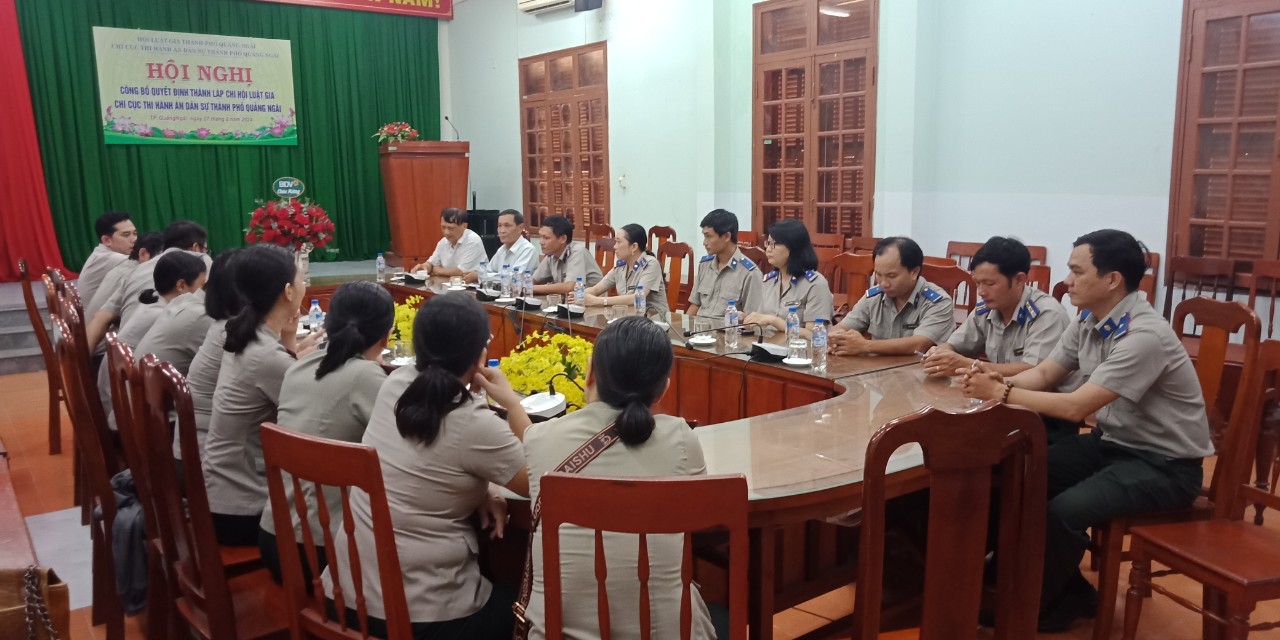 Chiều ngày 07/8/2024, Chi cục Thi hành án dân sự (THADS) thành phố Quảng Ngãi phối hợp với Hội Luật gia thành phố Quảng Ngãi tổ chức Lễ công bố và trao Quyết định thành lập Chi hội Luật gia Chi cục THADS thành phố Quảng Ngãi. Tham dự buổi lễ có Luật gia Đào Kim Kinh - Chủ tịch Hội Luật gia thành phố Quảng Ngãi, Luật gia Phạm Văn Phú – Phó Chủ tịch Hội Luật gia thành phố; đại diện Cấp ủy Chi bộ, Lãnh đạo, công chức Chi cục THADS thành phố, cùng toàn thể hội viên của Chi hội Luật gia Chi cục THADS.