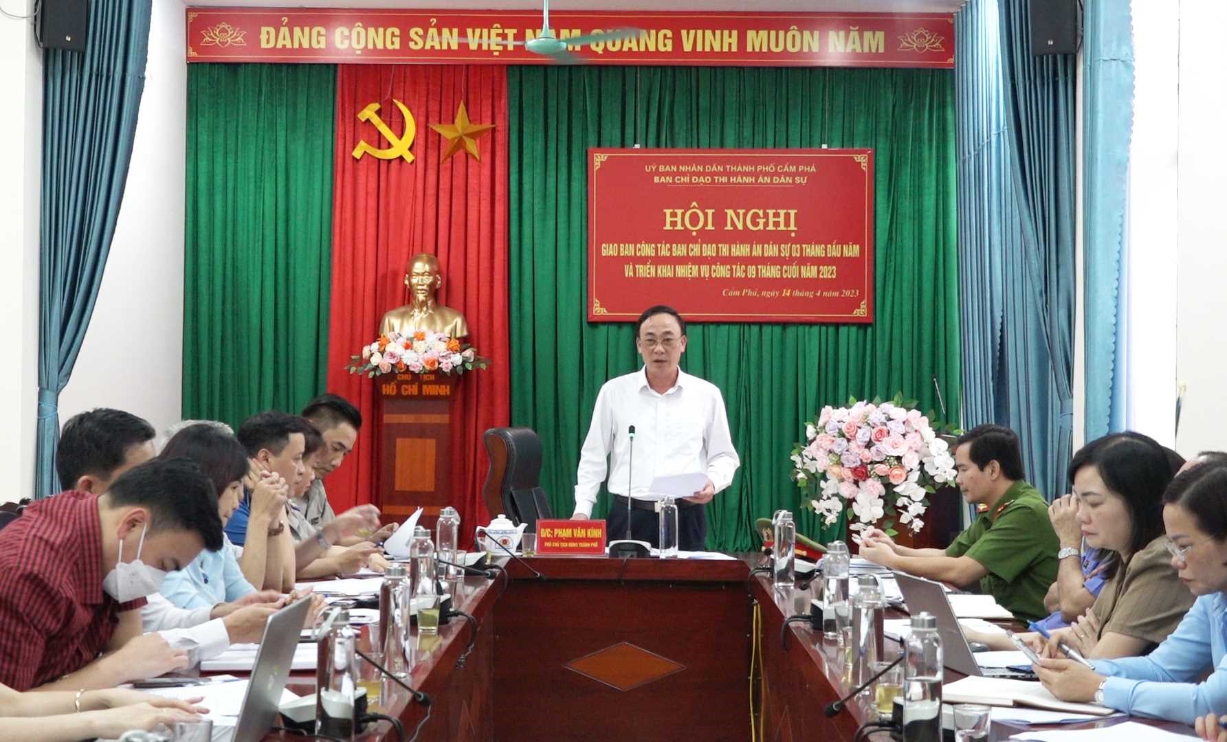 Đồng chí Phạm Tuấn Cảnh, Chi cục trưởng- Phó Ban chỉ đạo thi hành án dân sự thành phố báo cáo kết quả công tác thi hành án dân sự 03 tháng đầu năm, triển khai nhiệm vụ 09 tháng cuối năm 2023 trên địa bàn, cụ thể: Ngay từ đầu năm 2023, Ban Chỉ đạo Thi hành án dân sự (THADS) thành phố Cẩm Phả đã bám sát Chương trình, kế hoạch của Tổng cục THADS, Cục THADS tỉnh, Ban Chỉ đạo THADS tỉnh Quảng Ninh để chỉ đạo, triển khai đồng bộ các mặt công tác, phấn đấu hoàn thành các chỉ tiêu, nhiệm vụ được giao. Trong 03 tháng đầu năm, toàn thành phố thụ lý mới 441 việc, tương đương với số tiền trên 236 tỷ đồng. Đã thi hành xong 363 việc, tương đương số tiền trên 18 tỷ đồng, đạt tỷ lệ 61,32% về việc và 13,24% về tiền. Việc có điều kiện thi hành là 592 việc, tương đương với số tiền trên 142 tỷ đồng. Thu cho Ngân sách Nhà nước 325 việc, tương đương trên 1.5 tỷ đồng. Công tác lãnh đạo, chỉ đạo, điều hành, phối hợp với các cơ quan, ban ngành, đoàn thể có liên quan trong công tác thi hành án ngày càng được triển khai bài bản, có hiệu quả, các mặt công tác khác được duy trì thực hiện có hiệu quả.
