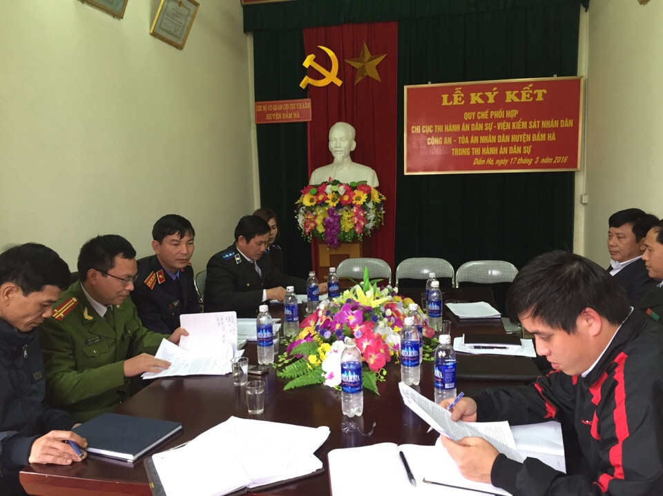 Thực hiện công văn số 1158/CTHADS-NV ngày 31/12/2015 của Cục Thi hành án dân sự tỉnh Quảng Ninh “Về việc yêu cầu rà soát, ký Quy chế phối hợp liên ngành”. Ngày 17 tháng 03 năm 2016, tại Hội trường Chi cục Thi hành án dân sự huyện Đầm Hà liên ngành Viện kiểm sát, Chi cục THADS, Tòa án và Công an tổ chức lễ ký kết “Quy chế Phối hợp liên ngành trong công tác thi hành án dân sự” trên địa bàn huyện Đầm Hà.