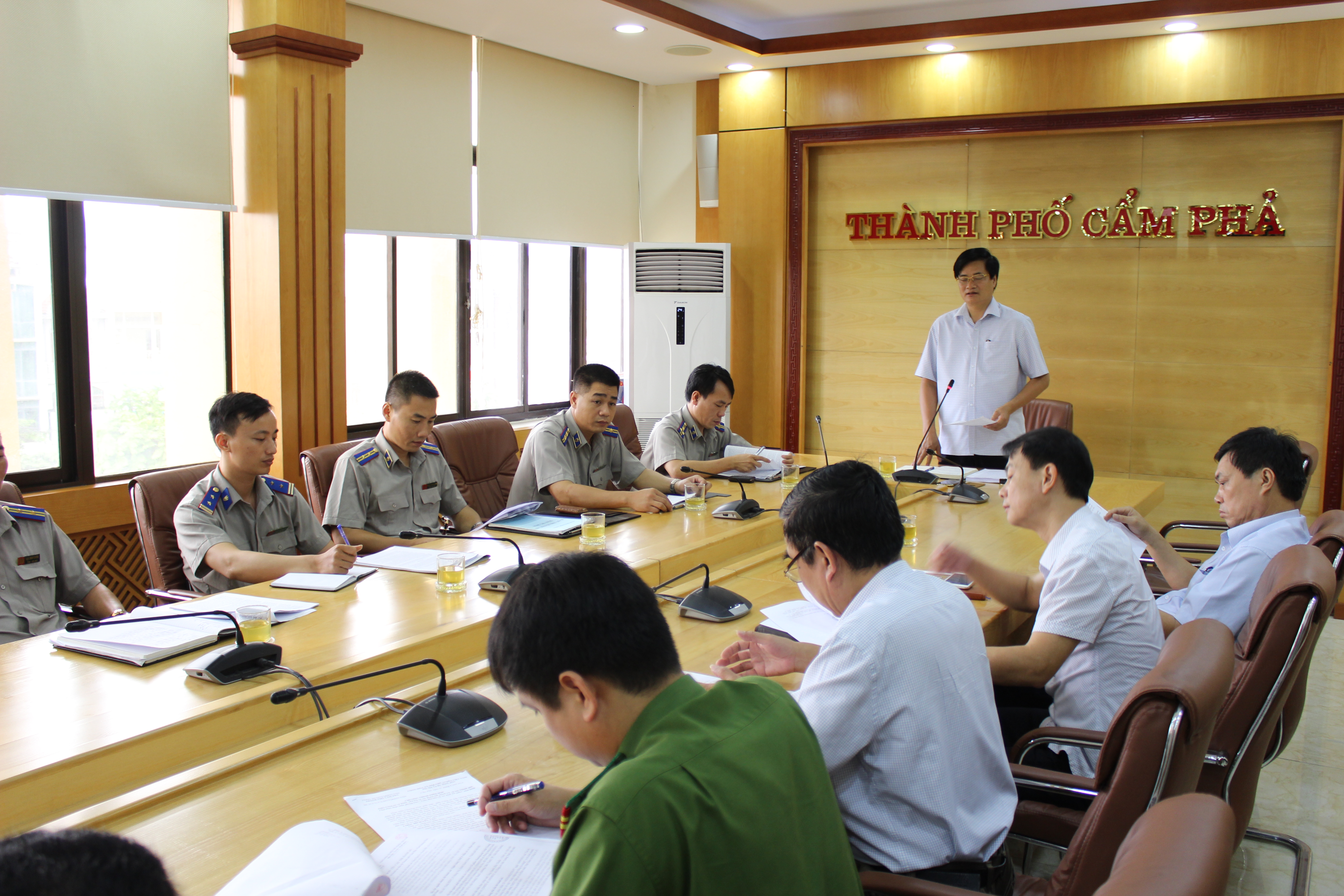 Sau khi nghe Lãnh đạo Chi cục Thi hành án dân sự thành phố báo cáo tình hình công tác thi hành án dân sự 06 tháng đầu năm 2018 và nội dung vụ việc dự kiến tổ chức cưỡng chế thi hành án trong thời gian tới: Việc cưỡng chế kê biên, xử lý tài sản là nhà đất mang tên ông Hoàng Gia Phát và bà Quách Thị Thuân, tại tổ 48 (nay là tổ 59) khu Diêm Thủy, phường Cẩm Đông, thành phố Cẩm Phả, hiện đang thế chấp tại Ngân hàng để thi hành án theo quyết định Bản án kinh doanh thương mại phúc thẩm số 06/2014/KDTM-PT ngày 10/9/2014 của Tòa án nhân dân tỉnh Quảng Ninh.