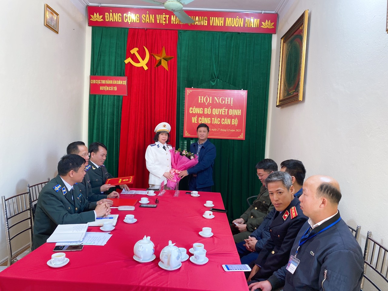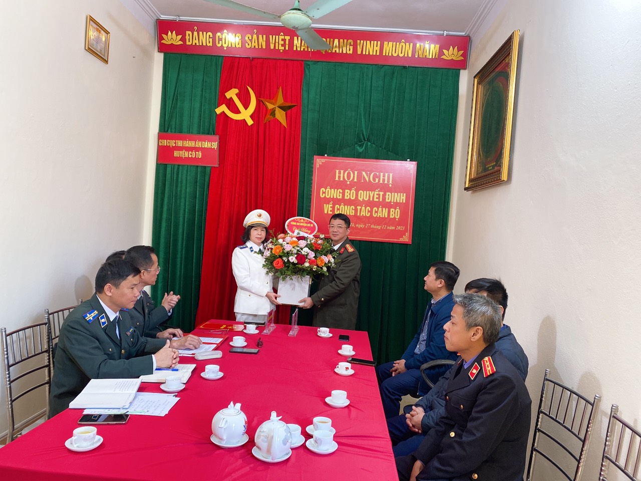 Ngày 27/12/2023, tại Trụ sở Chi cục Thi hành án dân sự huyện Cô Tô đã diễn ra Hội nghị công bố Quyết định về công tác cán bộ do Cục Thi hành án dân sự tỉnh Quảng Ninh tổ chức. Đại diện Cục Thi hành án dân sự tỉnh Quảng Ninh có ông Nguyễn Mạnh Thường, Phó Cục trưởng và ông Phạm Duy Hưng, Trưởng phòng Tổ chức cán bộ. Đại diện huyện Cô Tô có ông Đỗ Huy Thông, Phó Chủ tịch UBND huyện-Trưởng Ban Chỉ đạo Thi hành án dân sự huyện; các Ban, ngành thuộc huyện có đại diện Ban Tổ chức Huyện ủy, đại diện Phòng Nội vụ, đại diện lãnh đạo các cơ quan trong khối Nội chính gồm Công an huyện, Tòa án nhân dân huyện, Viện Kiểm sát nhân dân huyện, Ban Chỉ huy Quân sự huyện cùng toàn thể cán bộ công chức và người lao động Chi cục Thi hành án dân sự huyện Cô Tô.
