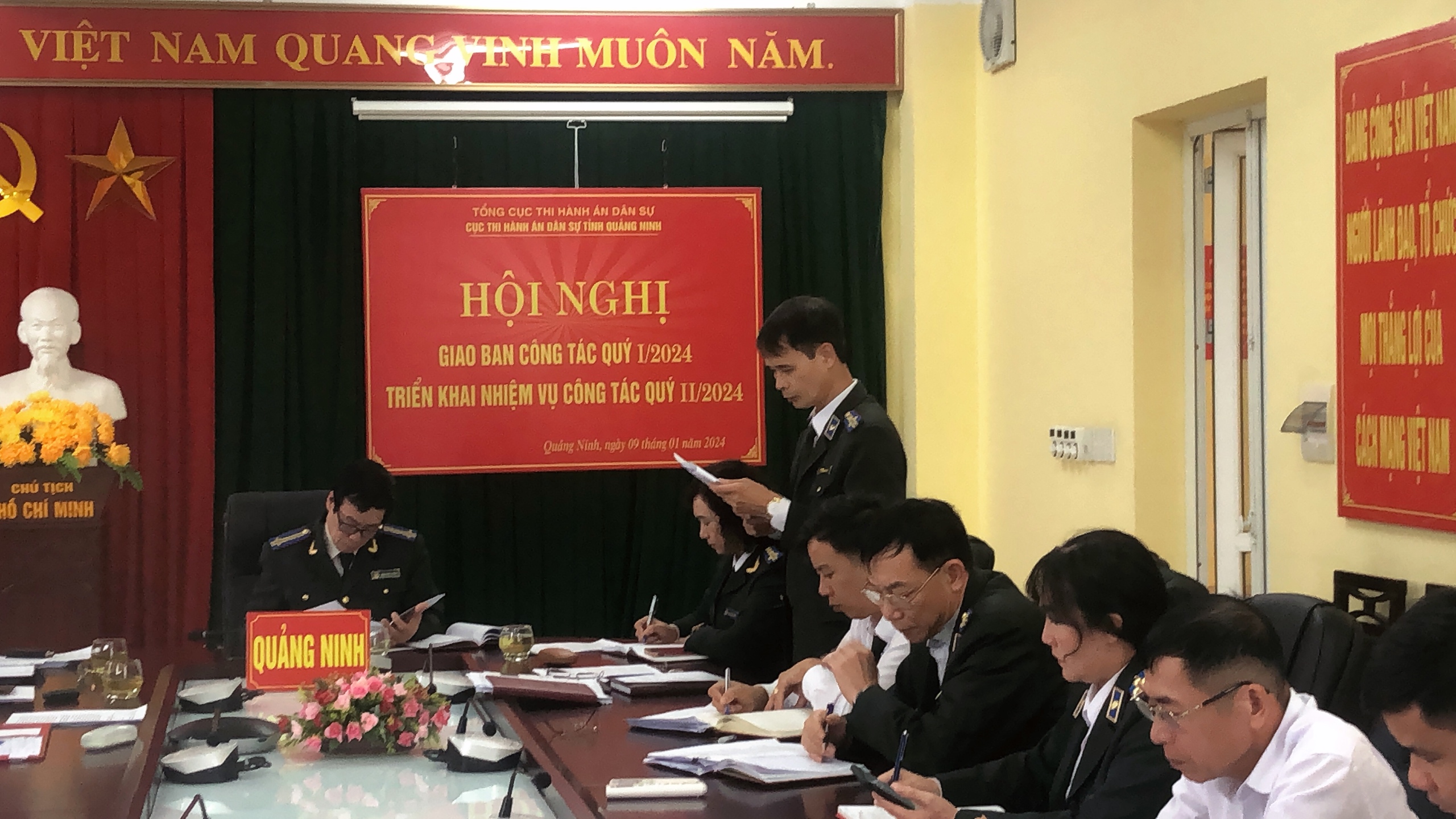 Chiều ngày 09/01/2024, Cục Thi hành án dân sự (THADS) tỉnh Quảng Ninh tổ chức giao ban công tác thi hành án dân sự, theo dõi thi hành án hành chính Quý I năm 2024 và nhiệm vụ trọng tâm công tác quý II năm 2024 do đồng chí Đinh Khắc Khang - Cục trưởng Cục THADS tỉnh chủ trì. Tham dự Hội nghị có các đồng chí Phó Cục trưởng, các đồng chí Lãnh đạo các phòng chuyên môn trực thuộc Cục và các đồng chí Lãnh đạo Chi cục THADS các huyện, thị xã và thành phố thuộc tỉnh.