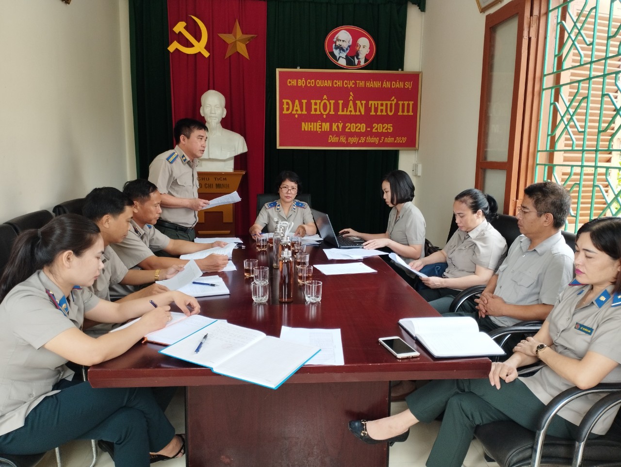 Đồng chí Nguyễn Đông Triều - Chi cục trưởng Chi Cục THADS huyện Đầm Hà thay mặt tập thể đơn vị trình bày báo cáo kết quả công tác THADS, theo dõi thi hành án hành chính theo nội dung kế hoạch kiểm tra của Đoàn kiểm tra Cục THADS và yêu cầu Chấp hành viên phụ trách giải quyết hồ sơ thi hành án, thư ký, công chức khác có liên quan đến nội dung hoạt động kiểm tra kịp thời phối hợp, cung cấp, chuẩn bị đầy đủ hồ sơ, tài liệu cho Đoàn kiểm tra.