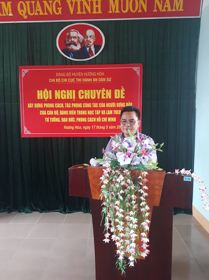 Thực hiện Chỉ thị số 05 - CT/TW ngày 15/5/2016 của Bộ chính trị về “đẩy mạnh học tập và làm theo tư tưởng, đạo đức, phong cách Hồ Chí Minh”; Hướng dẫn số 35-HD/BTGHU ngày 06/3/2018 của Ban Tuyên giáo Huyện ủy Hướng Hóa và Kế hoạch số 08-KH/CB ngày 24/4/2018 của Chi bộ Chi cục Thi hành án dân sự huyện Hướng Hóa về tổ chức diễn đàn Chi bộ năm 2018. Ngày 17/5/2018, Chi bộ Chi cục Thi hành án dân sự huyện Hướng Hóa đã tổ chức Hội nghị chuyên đề học tập và làm theo tư tưởng, đạo đức, phong cách Hồ Chí Minh với chủ đề “Xây dựng phong cách, tác phong công tác của người đứng đầu, của cán bộ, đảng viên trong học tập và làm theo tư tưởng, đạo đức, phong cách Hồ Chí Minh”
