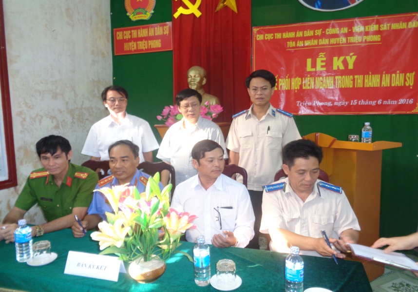 Ngày 15-6- 1016, Chi cục thi hành án dân sự huyện Triệu Phong cùng với Công an, Tòa án nhân dân, Viện kiểm sát nhân dân huyện ký kết Quy chế phối hợp liên ngành trong công tác thi hành án dân sự. Dự lễ ký kết có đồng chí Hồ Viết Hy, Phó Bí thư Huyện ủy, Chủ tịch UBND huyện, Trưởng Ban Chỉ đạo thi hành án dân sự huyện.