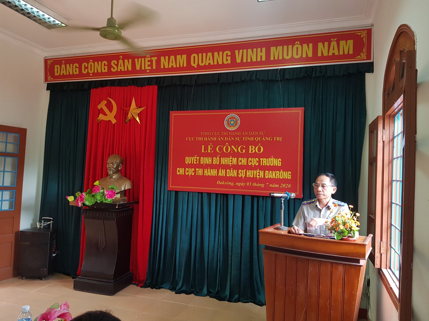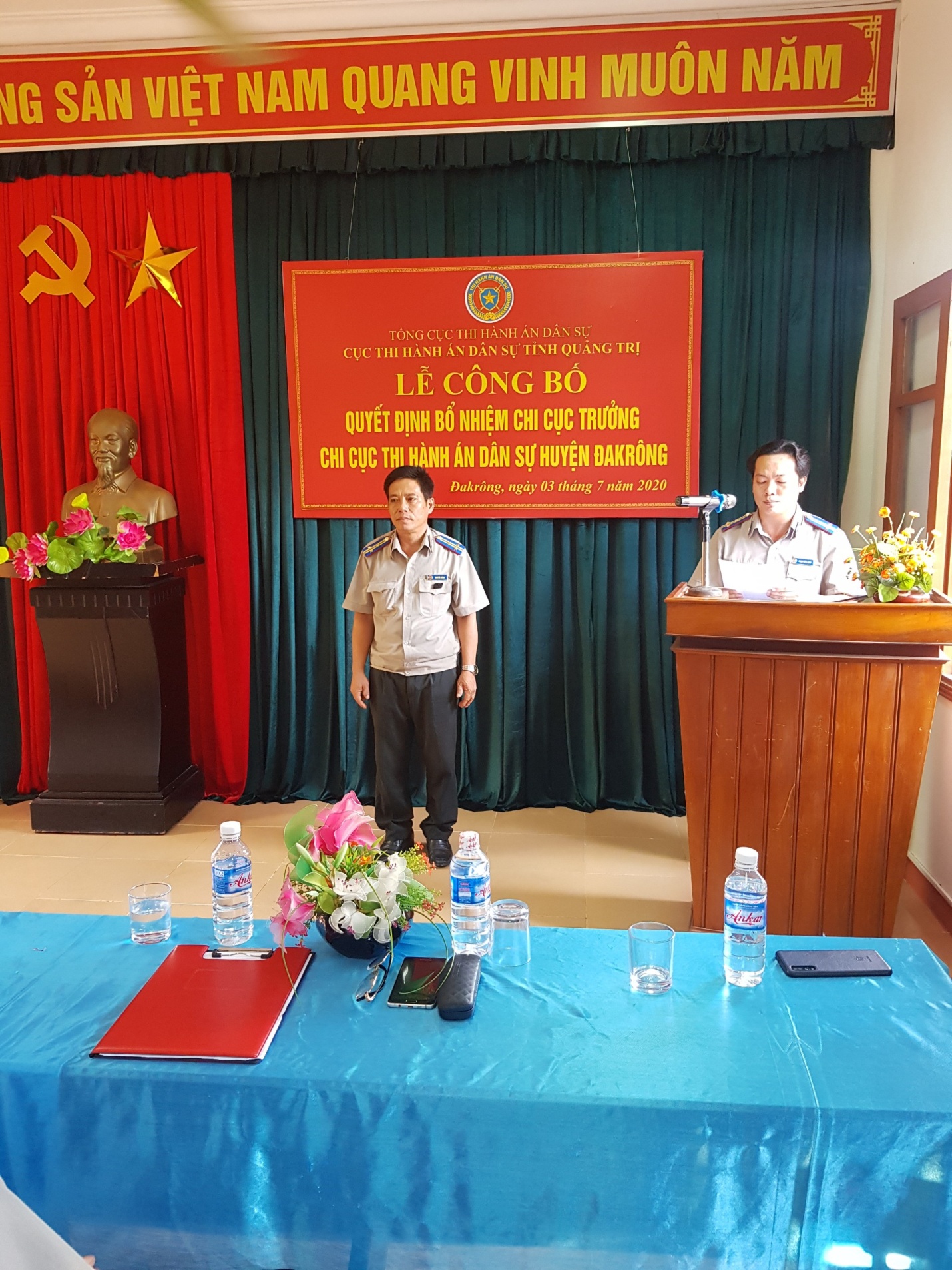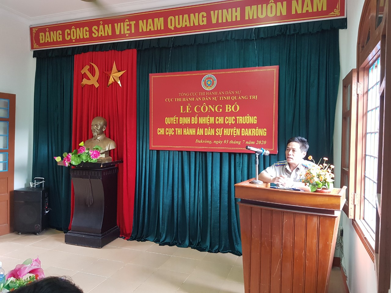 Chiều ngày 03/7/2020, Cục Thi hành án dân sự (THADS) tỉnh Quảng Trị đã tổ chức Lễ Công bố quyết định của Tổng Cục trưởng Tổng cục THADS về việc điều động và bổ nhiệm chức vụ Chi cục trưởng Chi cục THADS huyện Đakrông đối với đồng chí Nguyễn Trình. Tham dự buổi Lễ, có đồng chí Nguyễn Tài Ba - Cục trưởng Cục THADS tỉnh Quảng Trị chủ trì Lễ Công bố; đồng chí Nguyễn Đăng Sơn - Trưởng Ban Tổ chức Huyện ủy huyện Đakrông; Lãnh đạo các cơ quan, ban ngành địa phương; cùng toàn thể cán bộ, công chức và người lao động của Chi cục.