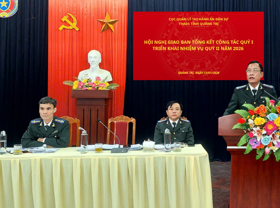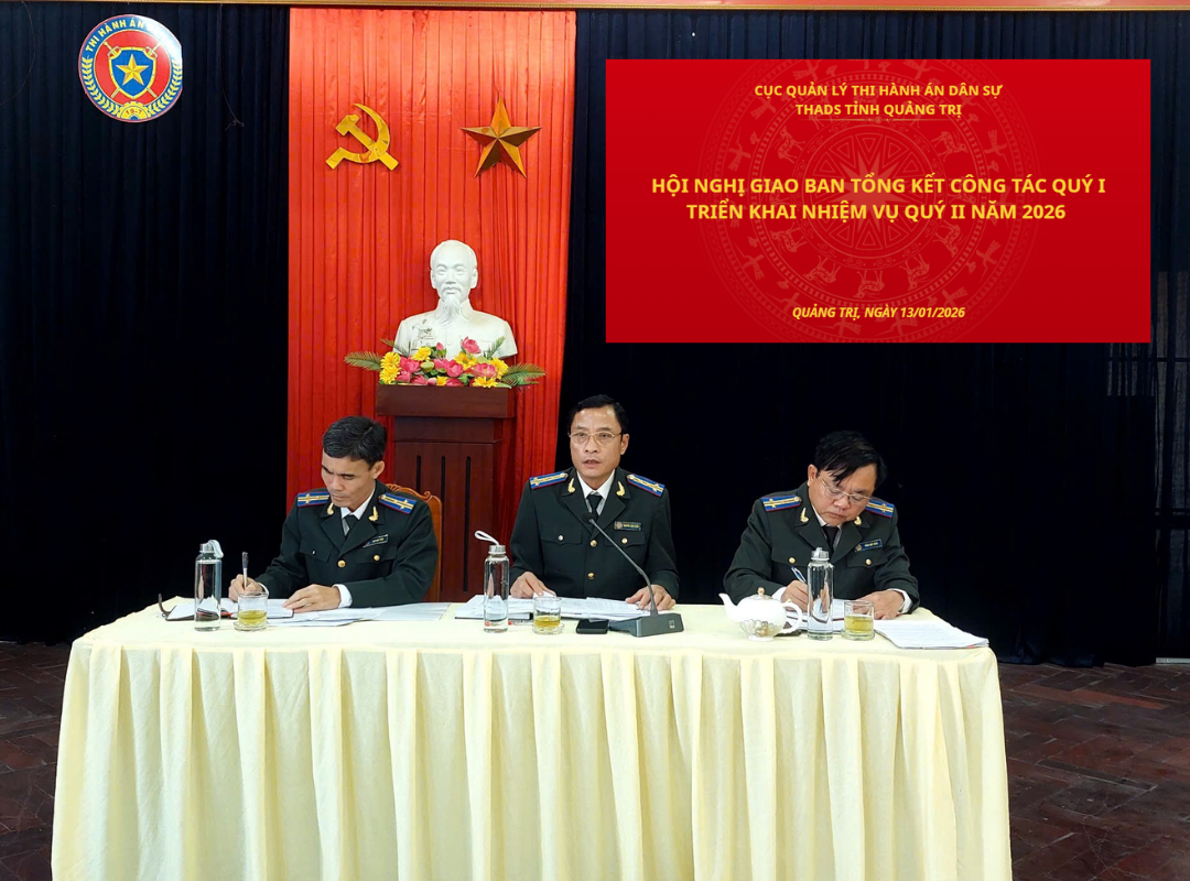 Chiều ngày 13/01/2026, tại trụ sở Thi hành án dân sự (THADS) tỉnh Quảng Trị (số 56 Nguyễn Hữu Cảnh), THADS tỉnh đã tổ chức Hội nghị giao ban nhằm tổng kết, đánh giá kết quả thực hiện nhiệm vụ công tác Quý I năm 2026 và triển khai nhiệm vụ trọng tâm Quý II năm 2026.