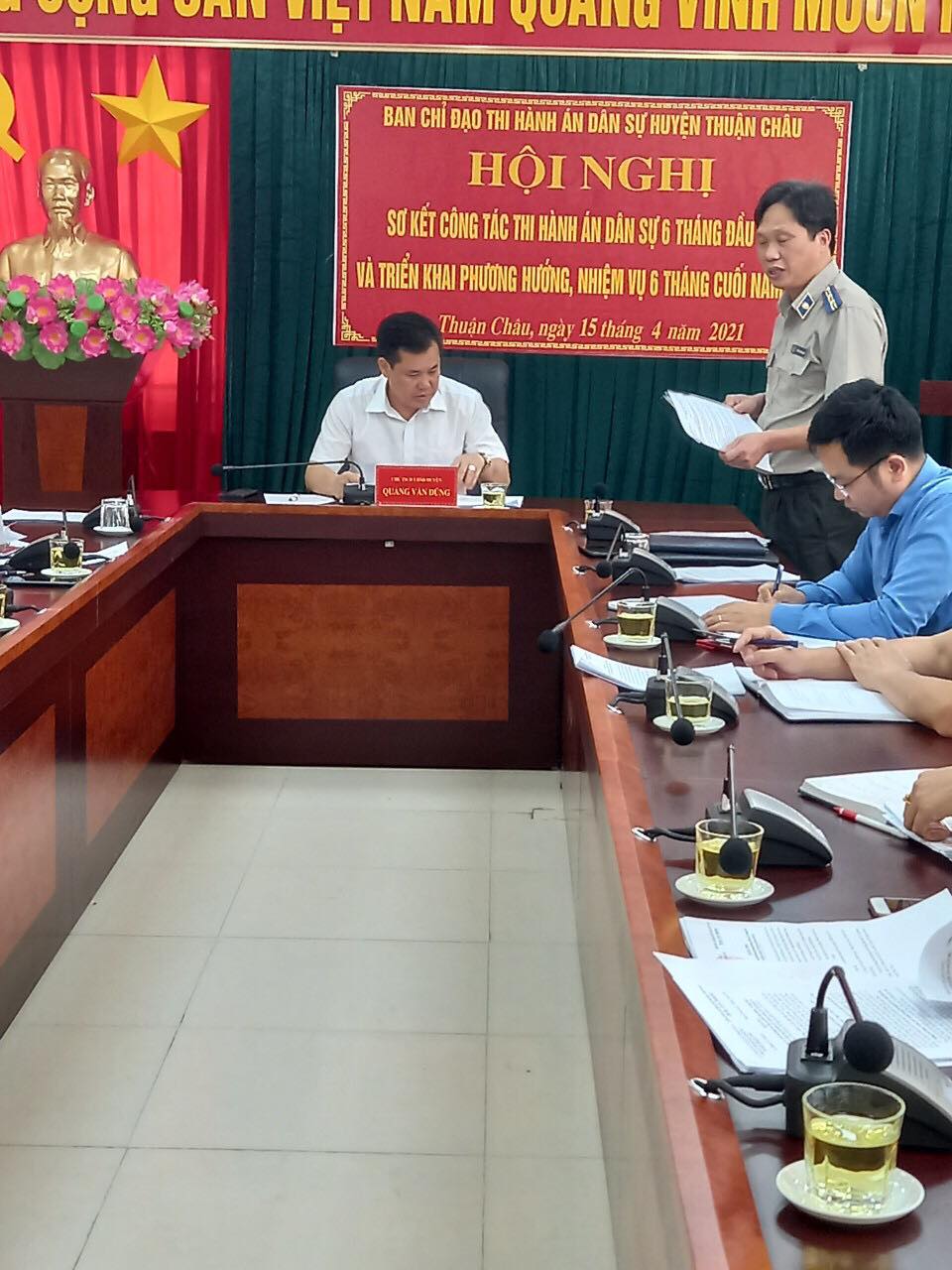 Ngày 15/4/2021, Ban Chỉ đạo Thi hành án dân sự (THADS) huyện Thuận Châu tổ chức Hội nghị sơ kết công tác 6 tháng đầu và phương hướng nhiệm vụ 6 tháng cuối năm 2021. Đồng chí Quàng Văn Dũng - Phó Bí thư huyện ủy, Chủ tịch UBND huyện - Trưởng Ban Chỉ đạo THADS huyện chủ trì hội nghị. Tham dự hội nghị có các thành viên Ban Chỉ đạo THADS và đại diện lãnh đạo Viện kiểm sát nhân dân huyện.