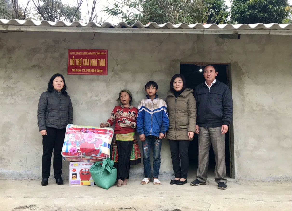 Trong năm 2020, Cục THADS tỉnh Sơn La đã tổ chức vận động công chức, người lao động trong toàn Ngành đóng góp một ngày lương để ủng hộ xã Hồng Ngài thực hiện chương trình xóa nhà tạm trên địa bàn với số tiền ủng hộ là 27,5 triệu đồng. Sau 3 tháng thi công với sự giúp đỡ của chính quyền, các đoàn thể của địa phương và huy động thêm một số nguồn lực khác, chiều 22/01/2021 đại diện lãnh đạo Cục Thi hành án dân sự tỉnh Sơn La đã phối hợp cùng chính quyền xã Hồng Ngài tiến hành bàn giao 01 ngôi nhà cho gia đình Bà Thào Thị Da dân tộc Mông tại bản Suối Háo, xã Hồng Ngài. Căn nhà được xây dựng khang trang với diện tích 31m2, tường xây gạch, lợp mái tôn với tổng kinh phí xây dựng hơn 30 triệu đồng. Gia đình bà Da có 02 con nhỏ, thuộc diện hộ nghèo, có hoàn cảnh đặc biệt khó khăn của xã Hồng Ngài, huyện Bắc Yên.