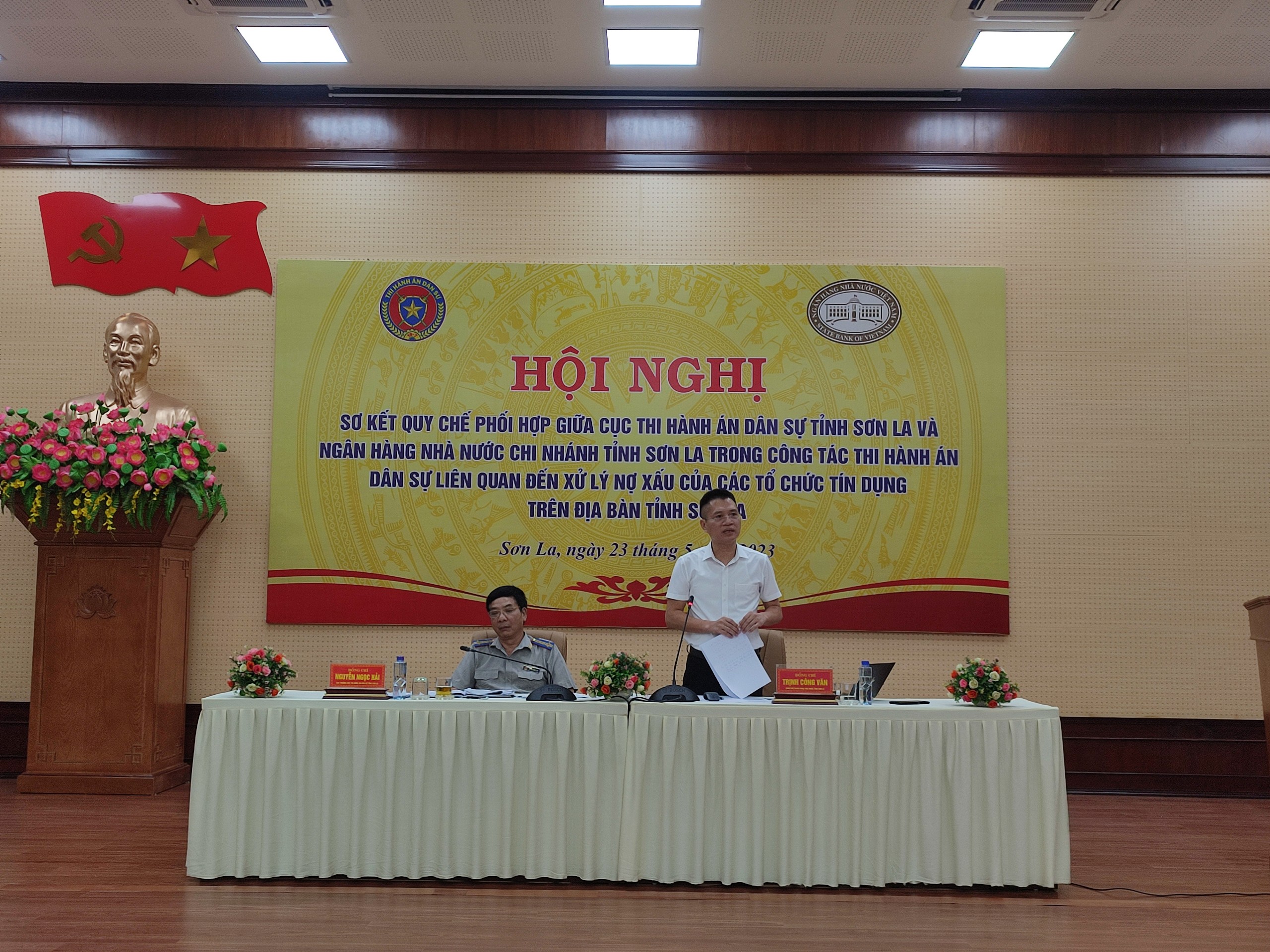 Ngày 23/5/2023, tại trụ sở Ngân hàng Nhà nước (NHNN) Chi nhánh tỉnh Sơn La đã tổ chức Hội nghị sơ kết Quy chế phối hợp số 01/QCLN/CTHADS-NHNNCNT ngày 21/10/2015 giữa Cục Thi hành án dân sự (THADS) tỉnh và NHNN Chi nhánh tỉnh Sơn La để đánh giá việc phối hợp thực hiện các quy định của pháp luật về THADS liên quan đến tín dụng, ngân hàng giữa các cơ quan THADS trong tỉnh và các tổ chức tín dụng, ngân hàng trên địa bàn tỉnh Sơn La. Đồng chí Trịnh Công Văn – Giám đốc NHNN Chi nhánh tỉnh Sơn La và đồng chí Nguyễn Ngọc Hải - Cục trưởng Cục THADS tỉnh Sơn La - đồng chủ trì hội nghị. Tham dự Hội nghị có hơn 100 đại biểu là tập thể lãnh đạo 2 ngành; các trưởng phòng chuyên môn thuộc Cục THADS tỉnh và NHNN Chi nhánh tỉnh Sơn La, Chi cục trưởng Chi cục THADS, Giám đốc/phó GĐ Chi nhánh ngân hàng TMCP, Ngân hàng Chính sách xã hội và Tổ chức tài chính vi mô trên địa bàn tỉnh Sơn La.