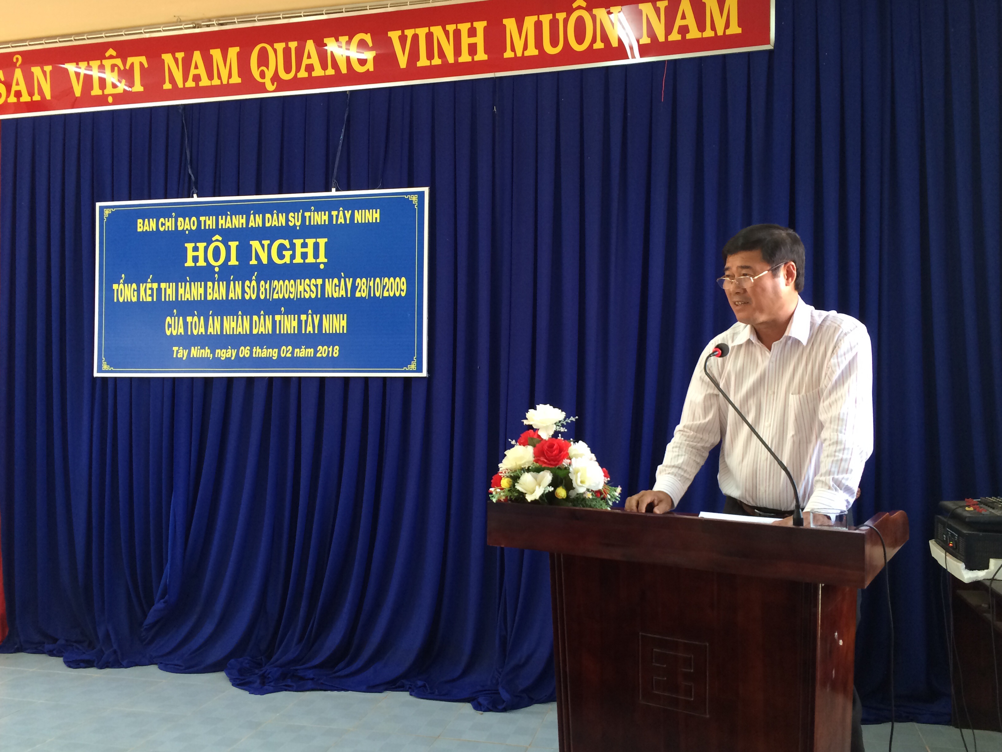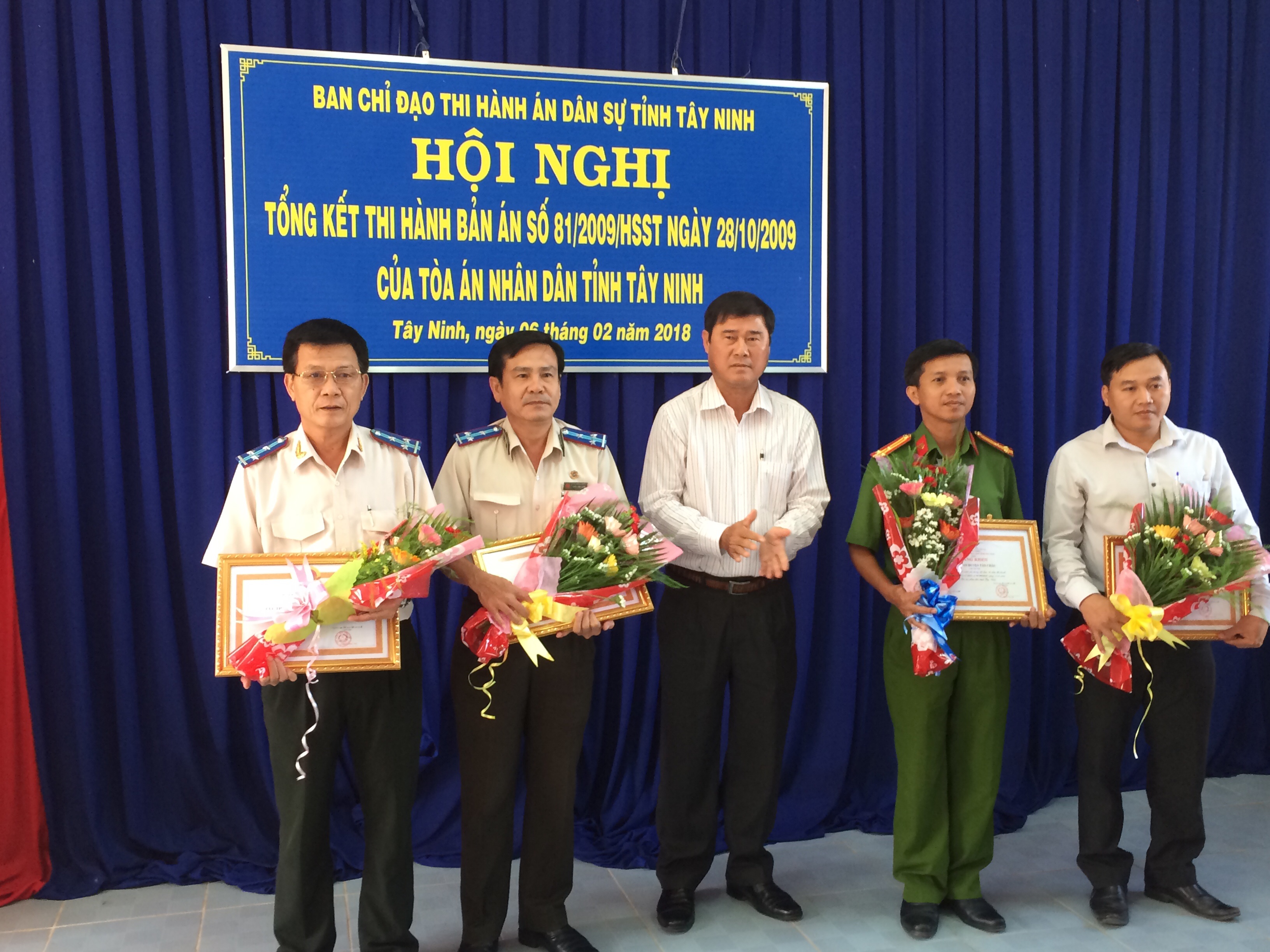 Để tổng kết, đánh giá những kết quả đã thực hiện được trong quá trình tổ chức thi hành Bản án số 81/2009/HSST ngày 28/10/2009 của Tòa án nhân dân tỉnh Tây Ninh, nhìn nhận nghiêm túc những tồn tại hạn chế và nguyên nhân của những tồn tại hạn chế, đồng thời rút ra bài học kinh nghiệm qua việc tổ chức thi hành bản án, chiều ngày 06/02/2018, tại Cục Thi hành án dân sự tỉnh Tây Ninh, Ban Chỉ đạo Thi hành án dân sự tỉnh tổ chức Hội nghị tổng kết thi hành Bản án số 81/2009/HSST ngày 28/10/2009 của Tòa án nhân dân tỉnh Tây Ninh (sau đây gọi là Bản án số 81). Tham dự Hội nghị, về phía Tổng cục Thi hành án dân sự, có đồng chí Nguyễn Thanh Thủy – Phó Tổng Cục trưởng Tổng cục Thi hành án dân sự; đồng chí Lê Tuấn Sơn – Phó Vụ trưởng Vụ Nghiệp vụ 2. Về phía địa phương, có đồng chí Nguyễn Minh Tân – Phó Bí thư thường trực Tỉnh ủy, đồng chí Trần Văn Chiến – Tỉnh ủy viên, Phó Chủ tịch Ủy ban nhân dân tỉnh, Trưởng Ban Chỉ đạo Thi hành án dân sự tỉnh, các thành viên Ban Chỉ đạo Thi hành án dân sự tỉnh...