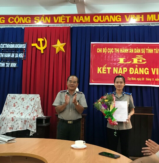 Tham dự buổi Lễ có đồng chí Thành Văn Trạc - Bí thư Chi bộ Chi cục Thi hành án dân sự tỉnh Tây Ninh cùng toàn thể đảng viên trong chi bộ. Lễ kết nạp diễn ra trong không khí trang nghiêm, đúng quy trình, thủ tục theo quy định của Điều lệ Đảng.