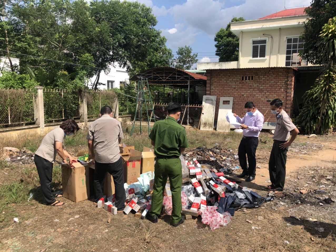 Số tang vật tiêu hủy gồm: 9.100 bao thuốc lá điếu các loại nhãn hiệu của Trung Quốc, trong đó có 09 bao thuốc lá điếu hiệu 555 và một số tang vật, vật chứng có liên quan đến các vụ vi phạm pháp luật do các ngành chức năng thu giữ của các đối tượng vi phạm trong quá trình tuần tra, truy quyét và đã được tiêu huỷ bằng cách đốt cháy toàn bộ số thuốc lá điếu không còn sử dụng được, đập bể làm biến dạng toàn bộ các tang vật vi phạm phát luật theo quy định.