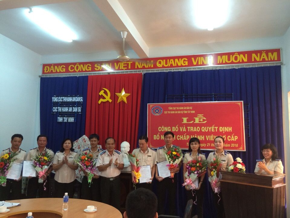 Ngày 21/11/2016, tại trụ sở Cục Thi hành án dân sự tỉnh Tây Ninh, thừa uỷ quyền của Bộ trưởng Bộ Tư pháp, Cục Thi hành án dân sự tỉnh Tây Ninh tổ chức Lễ công bố, trao quyết định bổ nhiệm Chấp hành viên sơ cấp cho 07 Thư ký thi hành án đang công tác tại các cơ quan Thi hành án dân sự trong tỉnh. Tham dự buổi Lễ có đồng chí Lê Văn Tiễn - Cục trưởng, các Phó Cục trưởng, Lãnh đạo các Phòng chuyên môn thuộc Cục và Lãnh đạo của 07 Chi cục THADS huyện có công chức được bổ nhiệm Chấp hành viên sơ cấp.