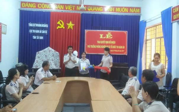 Thực hiện công tác kiện toàn chức danh lãnh đạo, quản lý các cơ quan Thi hành án dân sự tỉnh Tây Ninh, sáng ngày 24/02/2017, Cục Thi hành án dân sự tổ chức Lễ công bố quyết định bổ nhiệm Phó trưởng Phòng Nghiệp vụ và Tổ chức Thi hành án đối với bà Lê Thị Thu Thảo - Chấp hành viên sơ cấp.