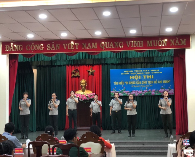 Thực hiện Quyết định số 260/QĐ-BTC ngày 26/9/2019 của Khối thi đua Nội chính về việc tổ chức Hội thi tìm hiểu Di chúc của Chủ tịch Hồ Chí Minh, nhằm góp phần giáo dục, nâng cao nhận thức của cán bộ, đảng viên trong việc học tập và làm theo tư tưởng, đạo đức, phong cách Hồ Chí Minh, đồng thời tạo điều kiện cho cán bộ, công chức của các thành viên trong Khối giao lưu, thể hiện sự hiểu biết, tài năng, chia sẻ kinh nghiệm, ngày 24/10/2019, tại Hội trường Bộ Chỉ huy quân sự tỉnh Tây Ninh, Khối thi đua Nội chính tổ chức Hội thi “Tìm hiểu Di chúc của Chủ tịch Hồ Chí Minh”.