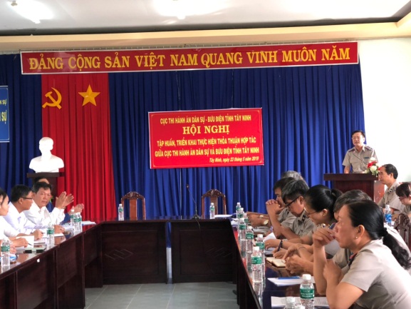 Thực hiện Thỏa thuận hợp tác giữa Cục Thi hành án dân sự và Bưu điện tỉnh Tây Ninh, nhằm góp phần thực hiện cải cách thủ tục hành chính trong lĩnh vực Thi hành án dân sự, nâng cao chỉ số hài lòng của người dân; tạo điều kiện thuận lợi cho tổ chức, cá nhân và doanh nghiệp đến giải quyết thủ tục hành chính trong lĩnh vực thi hành án dân sự, sáng ngày 23/5/2019, Cục Thi hành án dân sự phối hợp với Bưu điện tỉnh Tây Ninh tổ chức triển khai, tập huấn thực hiện Thỏa thuận hợp tác giữa Cục Thi hành án dân sự và Bưu điện tỉnh Tây Ninh (Thỏa thuận hợp tác).