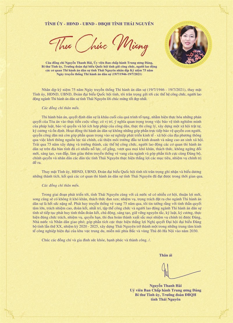 Thay mặt Tỉnh ủy, HĐND, UBND, Đoàn đại biểu Quốc hội tỉnh, Bí thư Nguyễn Thanh Hải trân trọng gửi tới các thế hệ công chức, người lao động ngành Thi hành án dân sự tỉnh Thái Nguyên lời chúc mừng tốt đẹp nhất.