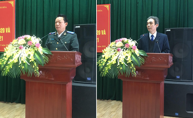 Đ/c Bùi Mạnh Khoa, Bí thư Đảng bộ, Cục trưởng (ảnh trái) và Đ/c Lê Hải Quân, Ủy viên Ban Thường vụ, Trưởng Ban Tuyên giáo ĐUK các cơ quan và doanh nghiệp tỉnh Thanh Hóa (ảnh phải) phát biểu chỉ đạo Hội nghị