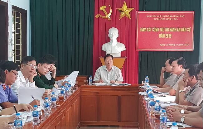 Ngày 16 tháng 11 năm 2018, Ban pháp chế Hội đồng nhân dân thành phố Thanh Hóa do đồng chí Lê Anh Tuấn- Ủy viên Ban Thường vụ, Chủ nhiệm Ủy ban kiểm tra Thành ủy, Trưởng ban pháp chế Hội đồng nhân dân thành phố Thanh Hóa - đã tthực hiên giám sát công tác thi hành án dân sự tại Chi cục Thi hành án dân sự thành phố .