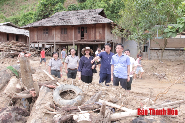 Bộ trưởng Bộ Tư pháp Lê Thành Long thị sát hiện trường nơi cơn lũ đi qua ở bản Sa Ná, xã Na Mèo