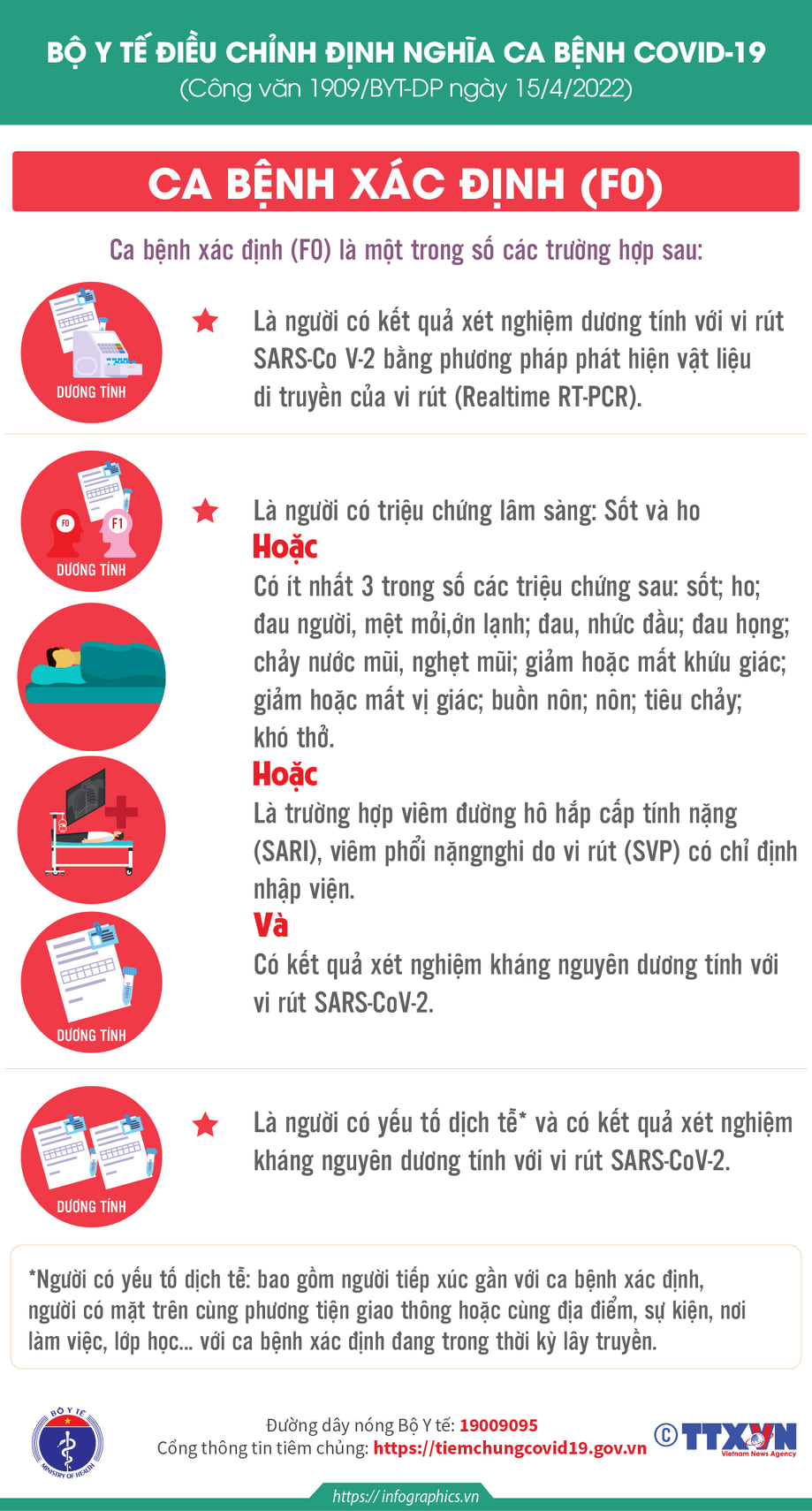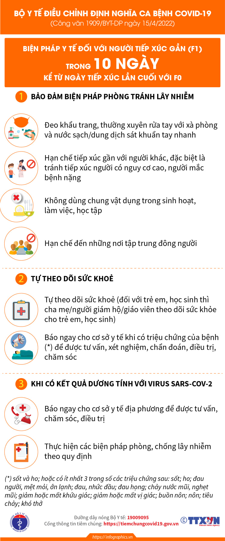 Công văn Số 1909/BYT-DP của Bộ Y tế ban hành ngày Ngày 15/4/2022, Bộ Y tế đã ban hành Công văn số 1909/BYT-DP về việc điều chỉnh định nghĩa ca bệnh COVID-19 và biện pháp y tế đối với ca bệnh COVID-19 và người tiếp xúc gần