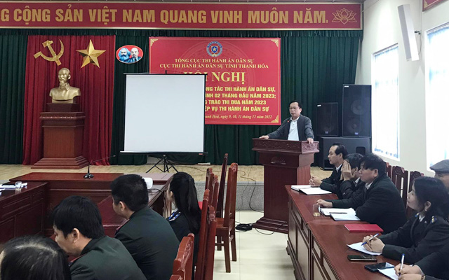 Trong 03 ngày 09, 10, 11/12/2022, Cục Thi hành án dân sự (THADS) tỉnh Thanh Hoá tổ chức Hội nghị Giao ban công tác THADS, theo dõi THAHC 02 tháng đầu năm 2023; phát động phong trào thi đua năm 2023 và tập huấn nghiệp vụ THADS