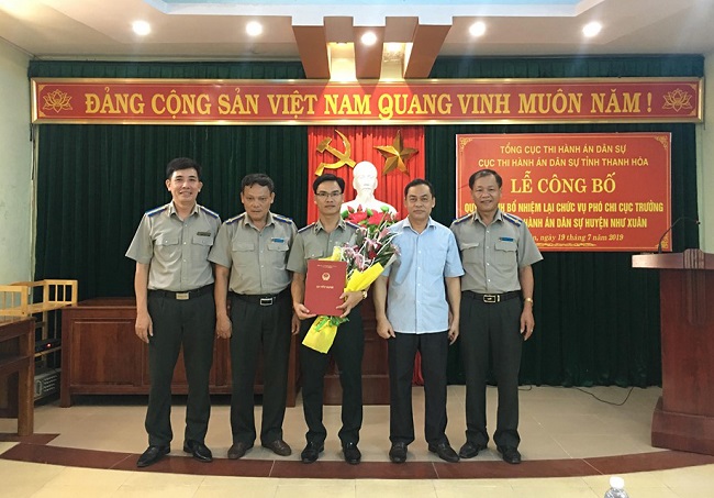 Ngày 19/7/2019, Cục Thi hành án dân sự tỉnh Thanh Hóa tổ chức lễ công bố quyết định bổ nhiệm lại chức vụ Phó Chi cục trưởng Chi cục THADS huyện Nông Cống và Phó Chi cục trưởng Chi cục THADS huyện Như Xuân. Tham dự Lễ công bố Quyết định có đồng chí Dương Thái Sơn, Phó Cục trưởng, đại diện lãnh đạo Phòng Tổ chức cán bộ cùng đại diện lãnh đạo huyện, đại diện lãnh đạo các ban, ngành trong huyện