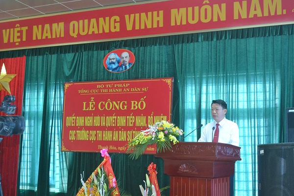 Thực hiện Quyết định số 499/QĐ-BTP và Quyết định số 1448/QĐ-BTP của Bộ trưởng Bộ Tư pháp về công tác cán bộ; chiều ngày 29/6/2018, Tổng Cục Thi hành án dân sự - Bộ Tư pháp tổ chức Lễ công bố Quyết định nghỉ hưu và Quyết định tiếp nhận, bổ nhiệm Cục trưởng Cục Thi hành án dân sự tỉnh Thanh Hóa.