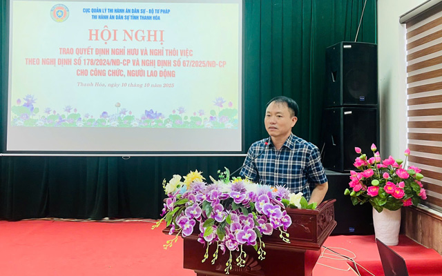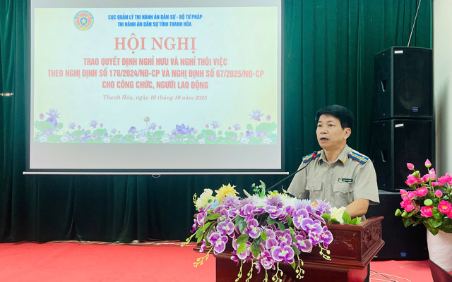 Ngày 10/10/2025, Thi hành án dân sự tỉnh Thanh Hóa trang trọng tổ chức Hội nghị trao Quyết định nghỉ hưu và nghỉ thôi việc theo Nghị định số 178/NĐ-CP và Nghị định số 67/2025/NĐ-CP cho công chức, người lao động