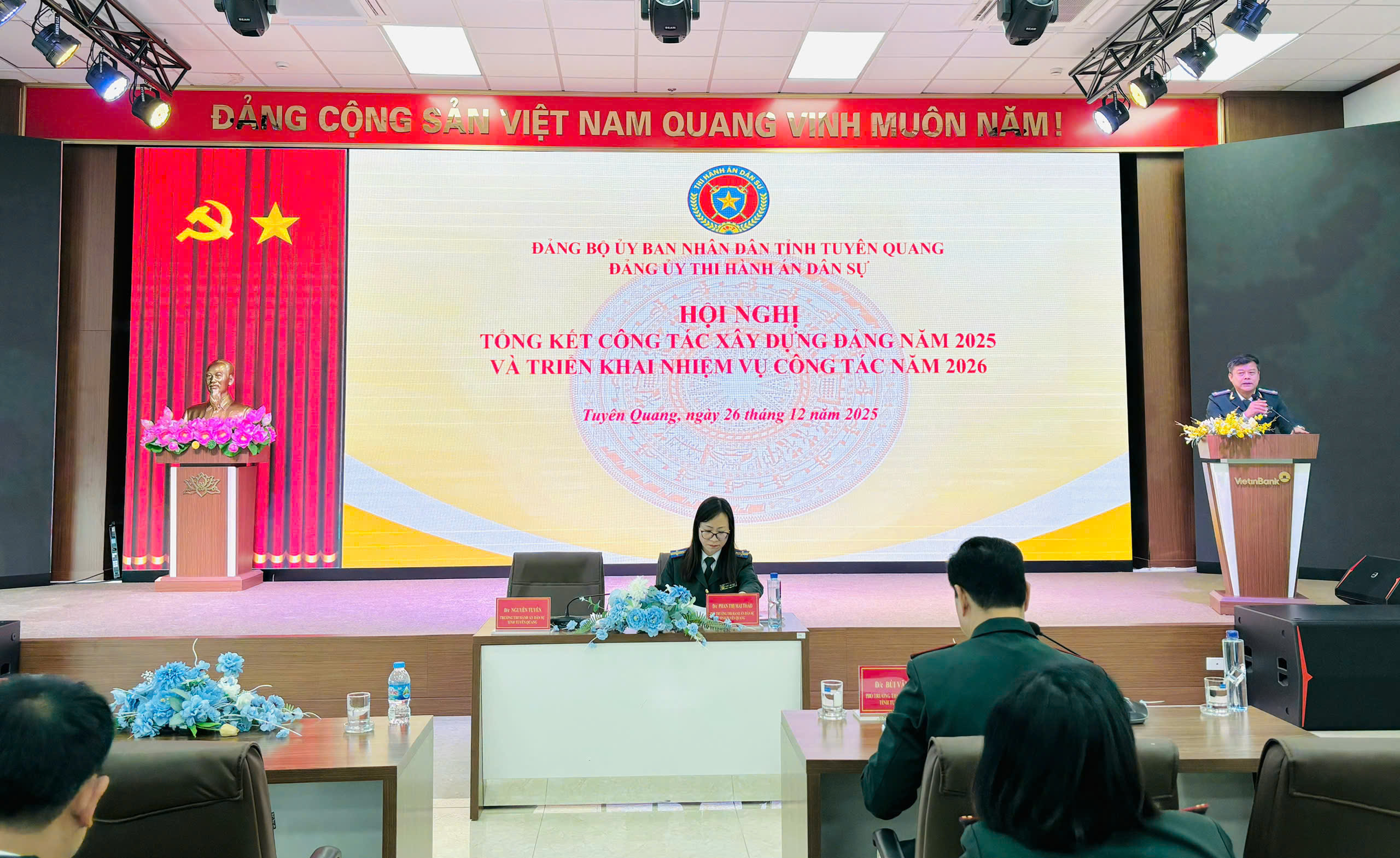 Thực hiện Kế hoạch số 08-KH/ĐU ngày 16/12/2025 của Đảng uỷ Thi hành án dân sự tỉnh Tuyên Quang, Kế hoạch số 40/KH-THADS ngày 16/12/2025 của Thi hành án dân sự tỉnh Tuyên Quang, chiều ngày 26/12/2025, Đảng bộ, cơ quan THADS tỉnh Tuyên Quang tổ chức Hội nghị tổng kết công tác năm 2025, triển khai nhiệm vụ công tác năm 2026 và Hội nghị cán bộ, công chức, người lao động năm 2026.