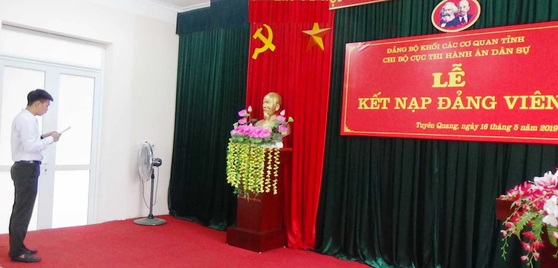 Ngày 16/05/2019, nhân kỷ niệm 129 năm Ngày sinh Chủ tịch Hồ Chí Minh, Chi bộ Cục Thi hành án dân sự tỉnh Tuyên Quang đã tổ chức Lễ kết nạp đảng viên cho quần chúng ưu tú Duy Thị Thúy và Lê Hữu Quang. Dự buổi lễ kết nạp có đồng chí Nguyễn Tuyên, Bí thư Chi bộ - Cục trưởng cục THADS; đồng chí Nguyễn Văn Quế, Phó Bí thư Chi bộ - Phó Cục trưởng, cùng toàn thể đảng viên của Chi bộ.