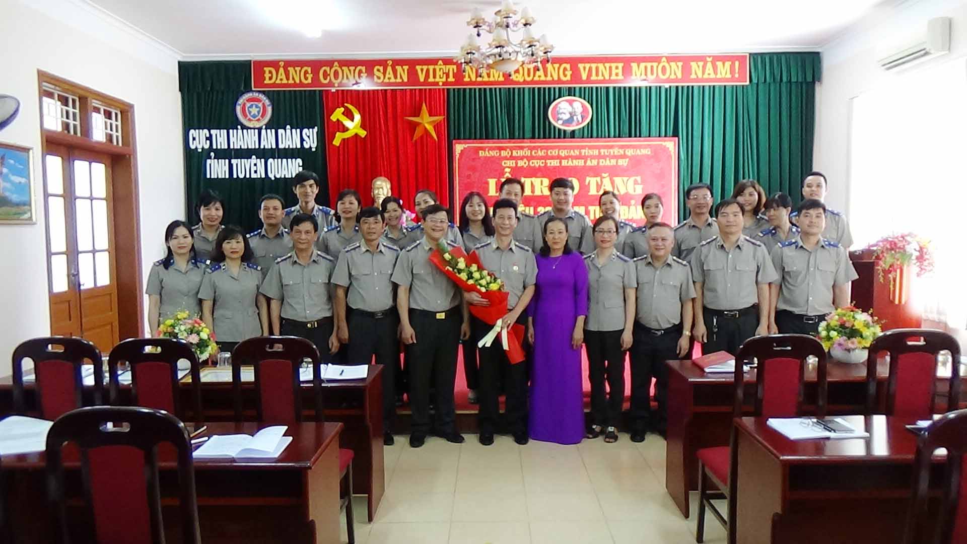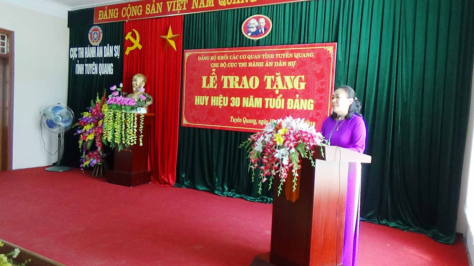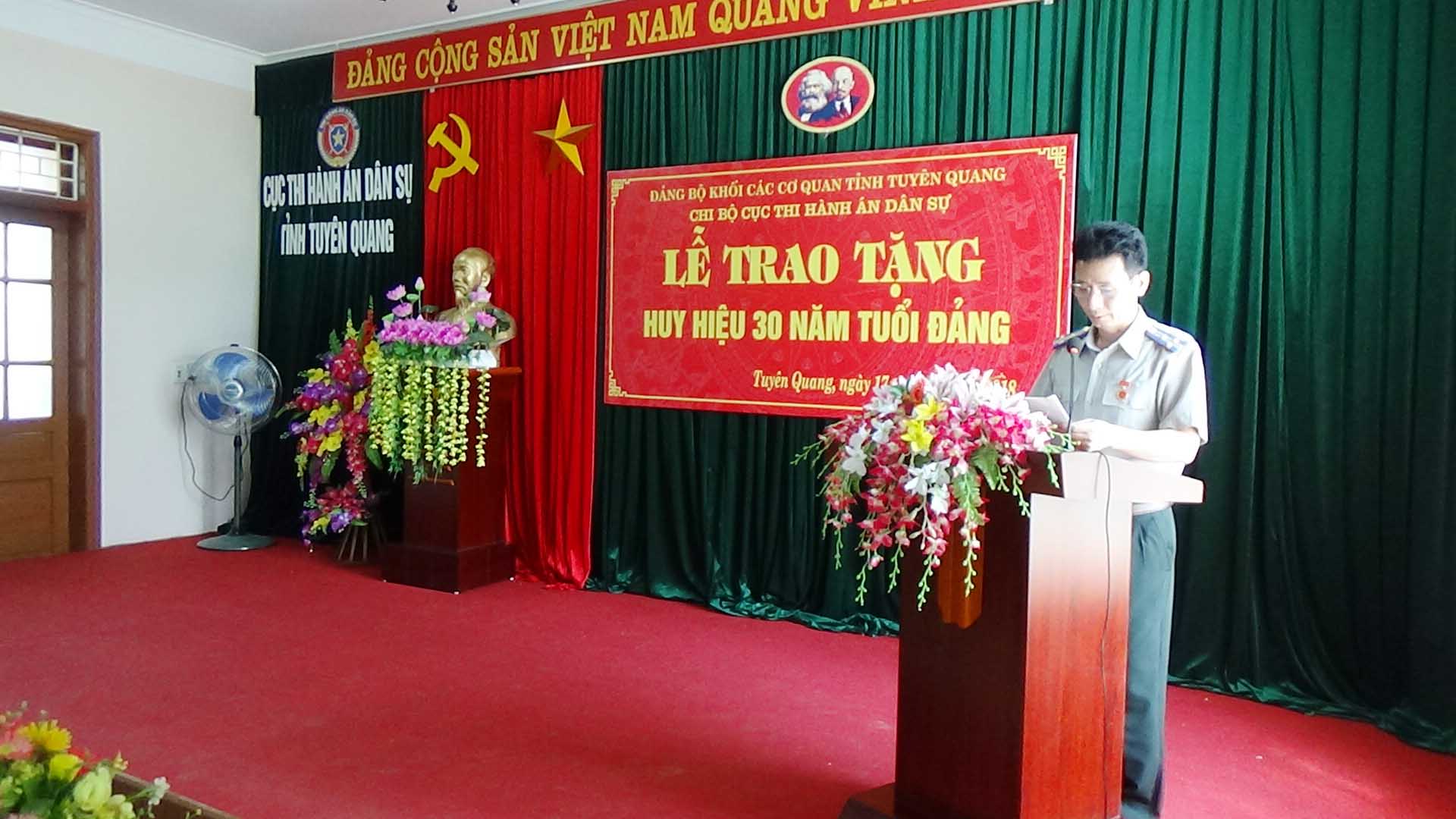 Ngày 17/5/2018, trong không khí vui mừng, phấn khởi thi đua chào mừng kỷ niệm 128 năm Ngày sang Chủ tịch Hồ Chí Minh, Chi bộ Cục Thi hành án dân sự tỉnh Tuyên Quang đã long trọng tổ chức lễ trao tặng huy hiệu 30 năm tuổi Đảng cho đ/c Hứa Đức Hạnh, Chi ủy viên, Phó Cục trưởng Cục THADS tỉnh. Tới dự buổi Lễ có đồng chí Đặng Thị Nhàn, Phó Bí thư, Chủ nhiệm UBKT Đảng ủy khối cơ quan tỉnh, Đ/c Nguyễn Tuyên, Bí thư chi bộ - Cục trưởng Cục THADS tỉnh cùng toàn thể các đồng chí đảng viên thuộc Chi bộ Cục THADS.