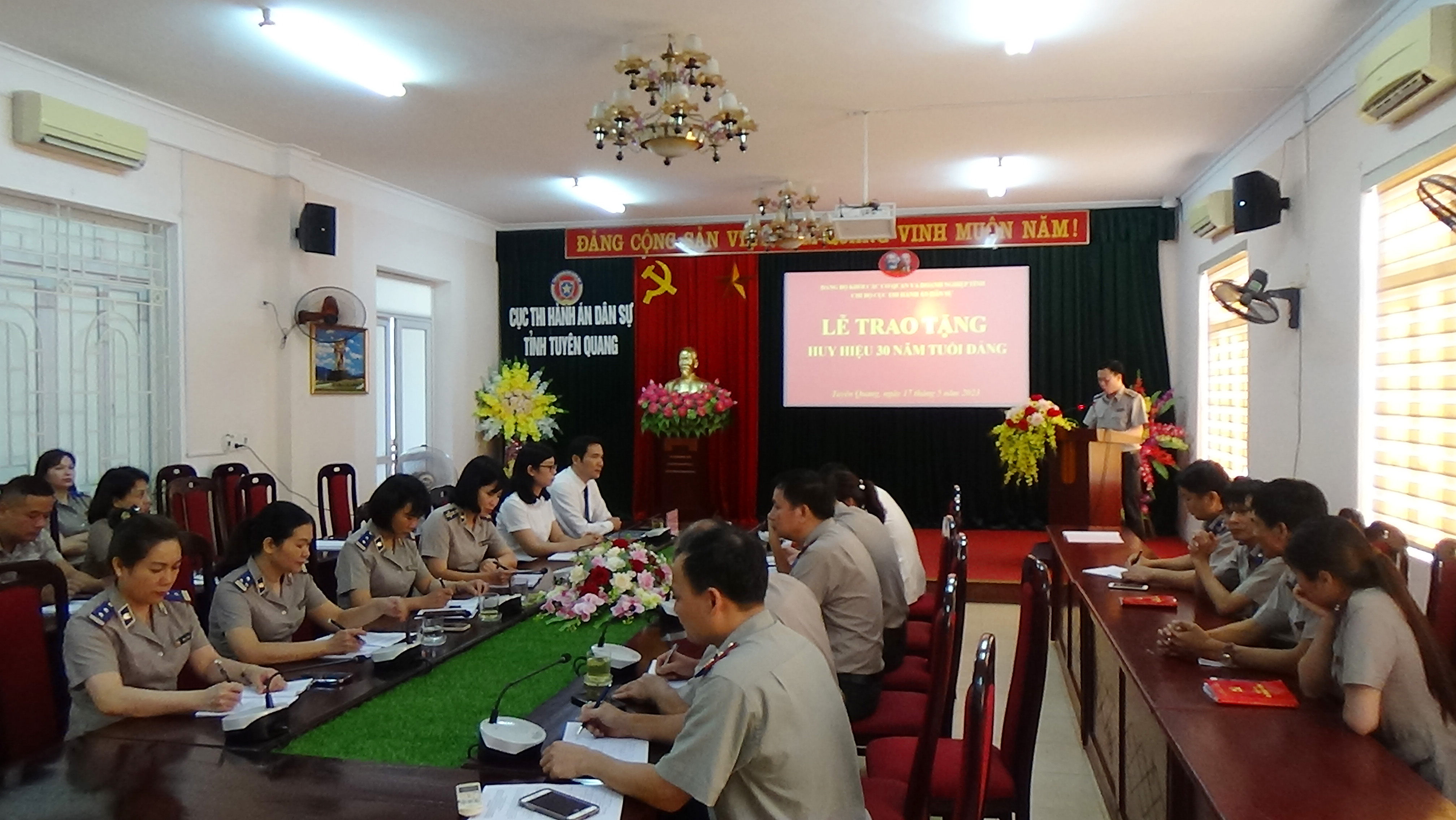 Chiều ngày 17/5/2023 nhân dịp kỷ niệm 133 năm Ngày sinh Chủ tịch Hồ Chí Minh, tại Trụ sở Cục Thi hành án dân sự tỉnh, Chi bộ Cục thi hành án dân sự tỉnh đã long trọng tổ chức Lễ trao tặng Huy hiệu 30 năm tuổi Đảng cho đồng chí Nguyễn Tuyên, Bí thư chi bộ - Cục trưởng Cục Thi hành án dân sự. Tham dự buổi lễ, có đồng chí Trần Việt Hùng, Phó Bí thư trường trực Đảng uỷ khối các cơ quan và Doanh nghiệp tỉnh; đồng chí Nguyễn Tuyên, Bí thư Chi bộ - Cục trưởng Cục; đ/c Phan Thị Mai Thảo, Phó Bí thư Chi bộ - Phó Cục trưởng cùng toàn thể Đảng viên Chi bộ Cục Thi hành án dân sự.