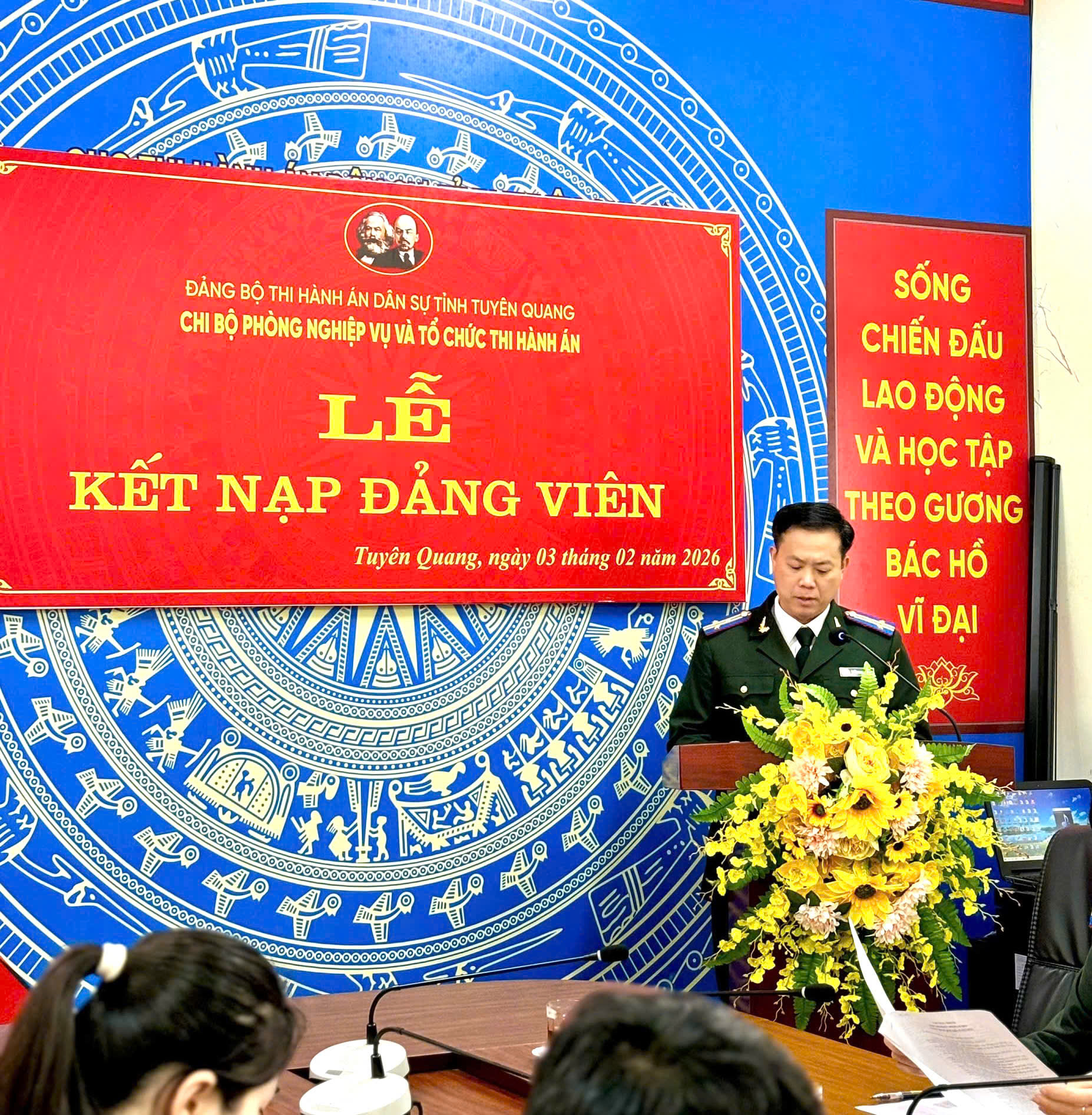 Sáng ngày 03/02/2026, Chi bộ Phòng Nghiệp vụ và tổ chức Thi hành án đã long trọng tổ chức Lễ kết nạp đảng viên mới cho quần chúng ưu tú Nguyễn Thu Trang theo Quyết định của Ban Thường vụ Đảng ủy Uỷ ban nhân dân tỉnh.