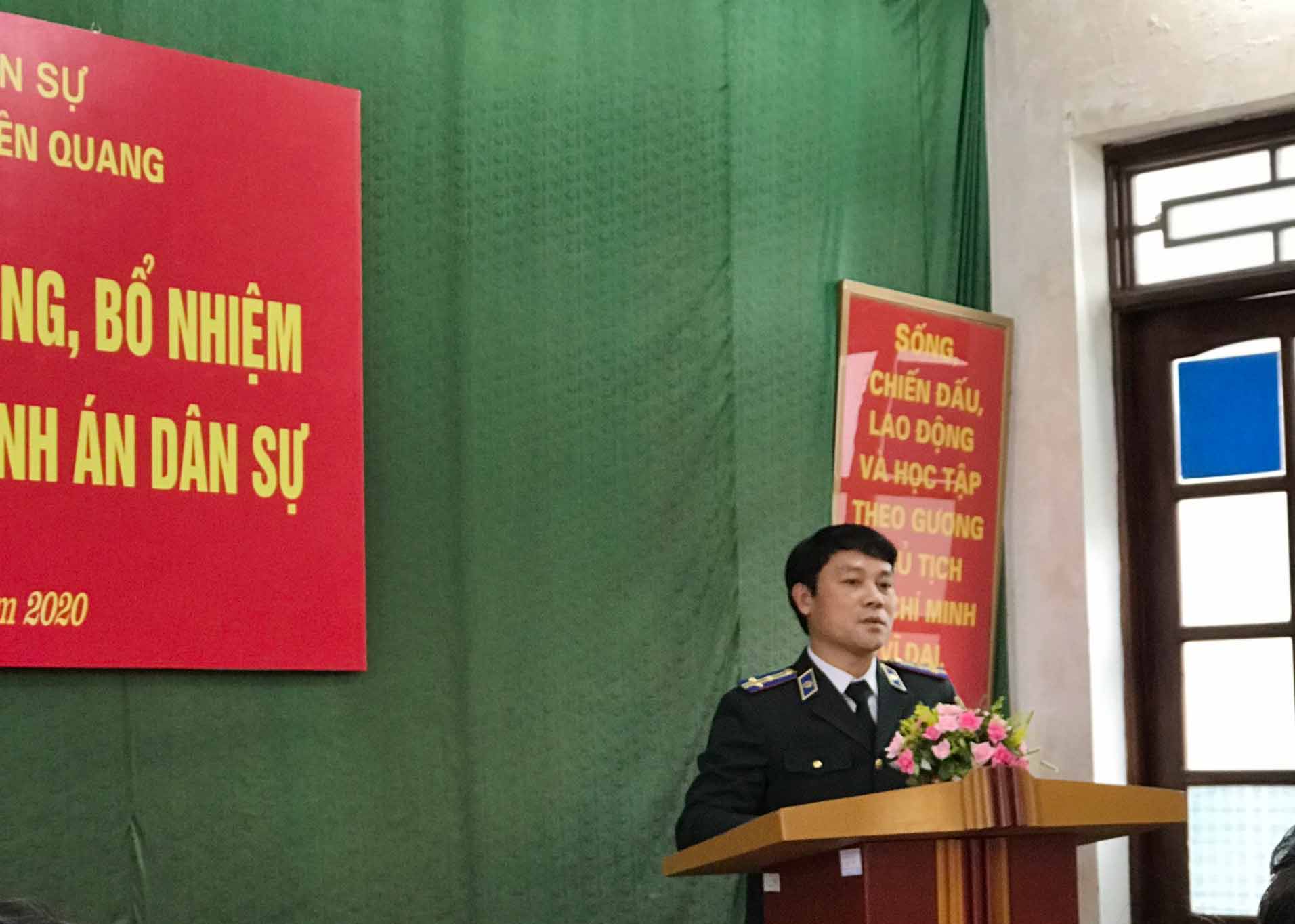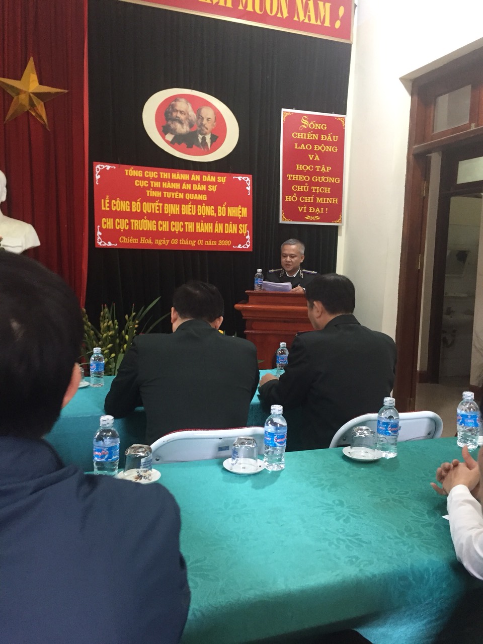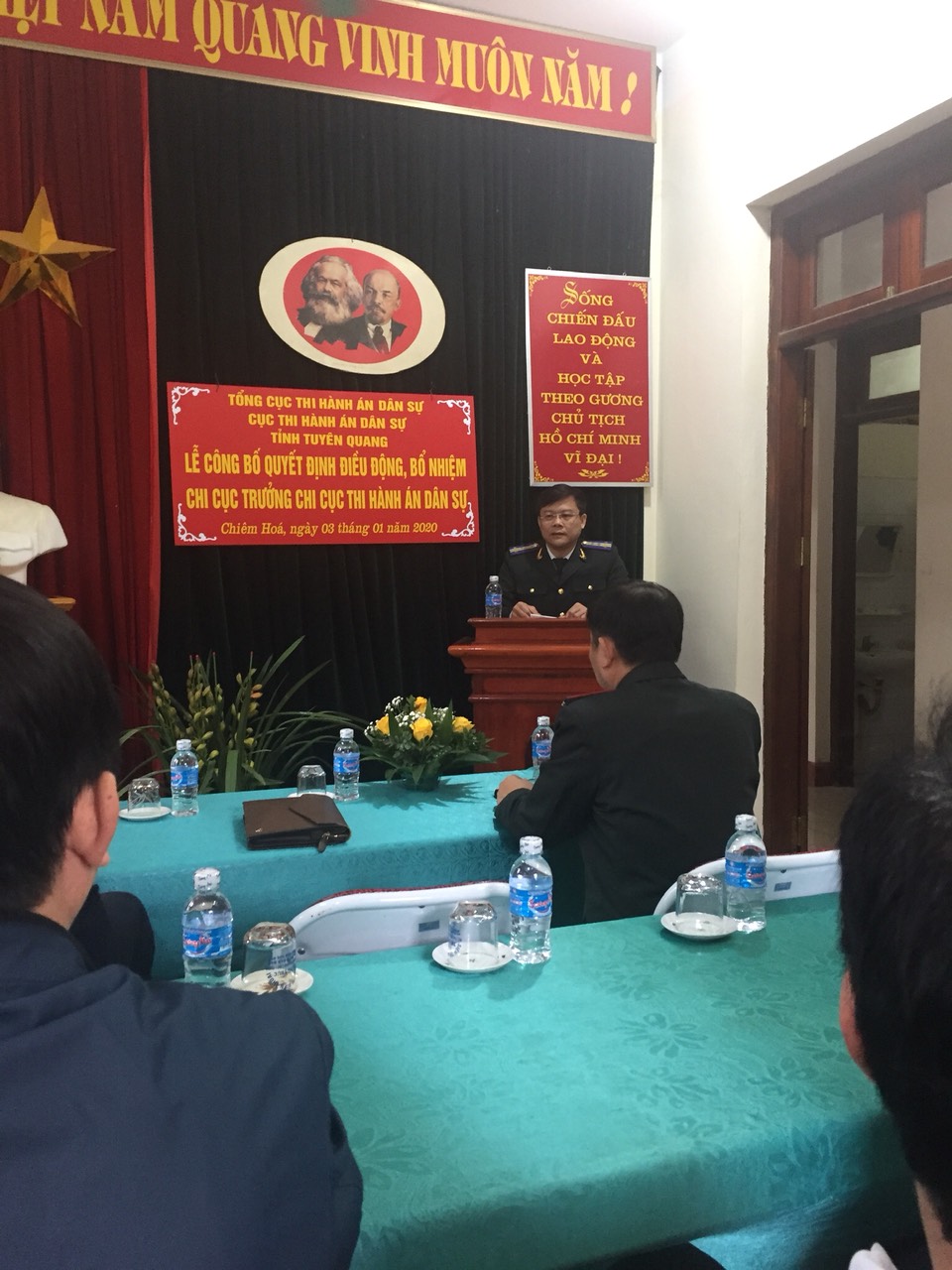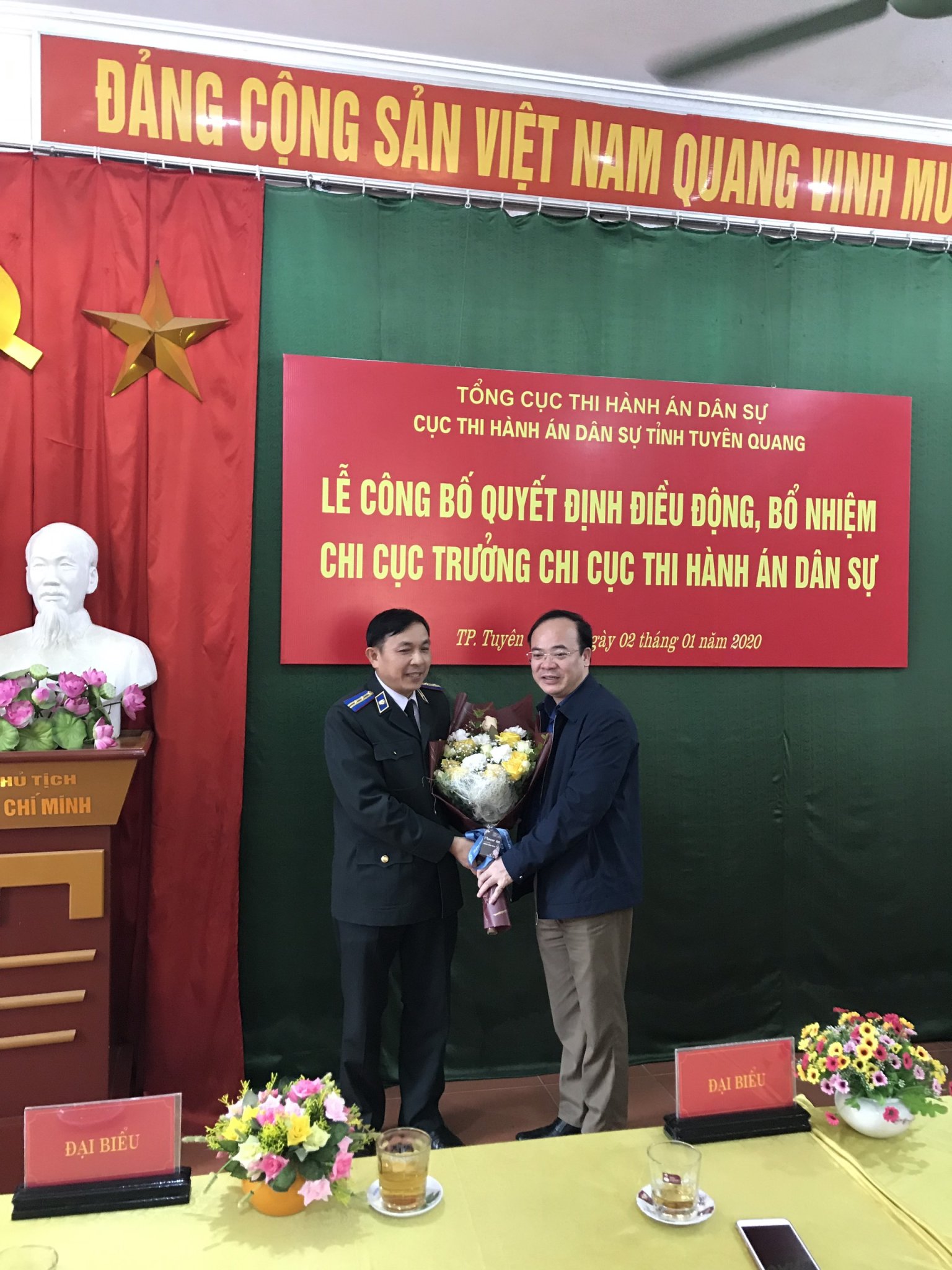 Tiếp đó, ngày 03/01/2020, Cục Thi hành án dân sự tỉnh Tuyên Quang tổ chức công bố và trao Quyết định số 1450/QĐ-TCTHADS ngày 17/12/2019 của Tổng cục Thi hành án dân sự về việc điều động, bổ nhiệm công chức giữ chức vụ lãnh đạo đối với ông Cao Trọng Thủy - Chi Cục trưởng Chi cục Thi hành án dân sự thành phố Tuyên Quang đến nhận công tác và bổ nhiệm giữ chức vụ Chi cục trưởng Chi cục Thi hành án dân sự huyện Chiêm Hóa từ ngày 01/01/2020. Tới dự buổi Lễ có đồng chí Hà Đức Tập - Phó Bí thư Thường trực Huyện ủy, Chủ tịch Hội đồng nhân dân huyện Chiêm Hóa; các thành viên Ban Chỉ đạo Thi hành án dân sự huyện Chiêm Hóa; Lãnh đạo các cơ quan, ban ngành có liên quan tại địa phương và lãnh đạo, công chức, người lao động Chi Cục THADS huyện Chiêm Hóa.