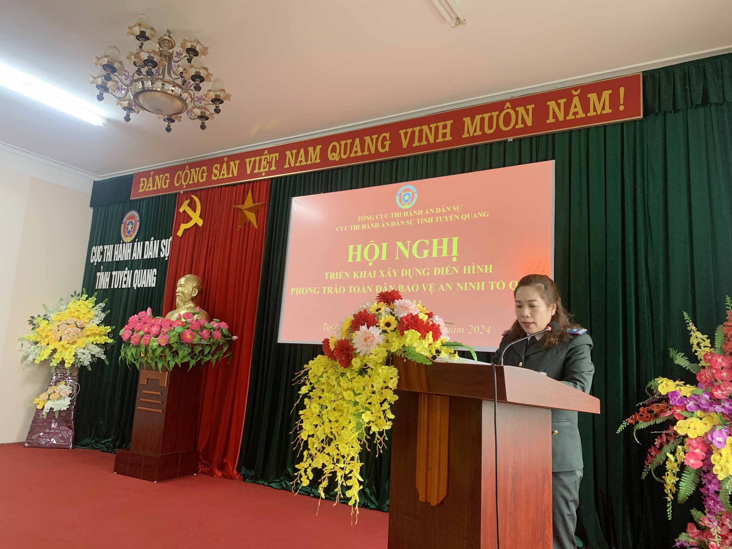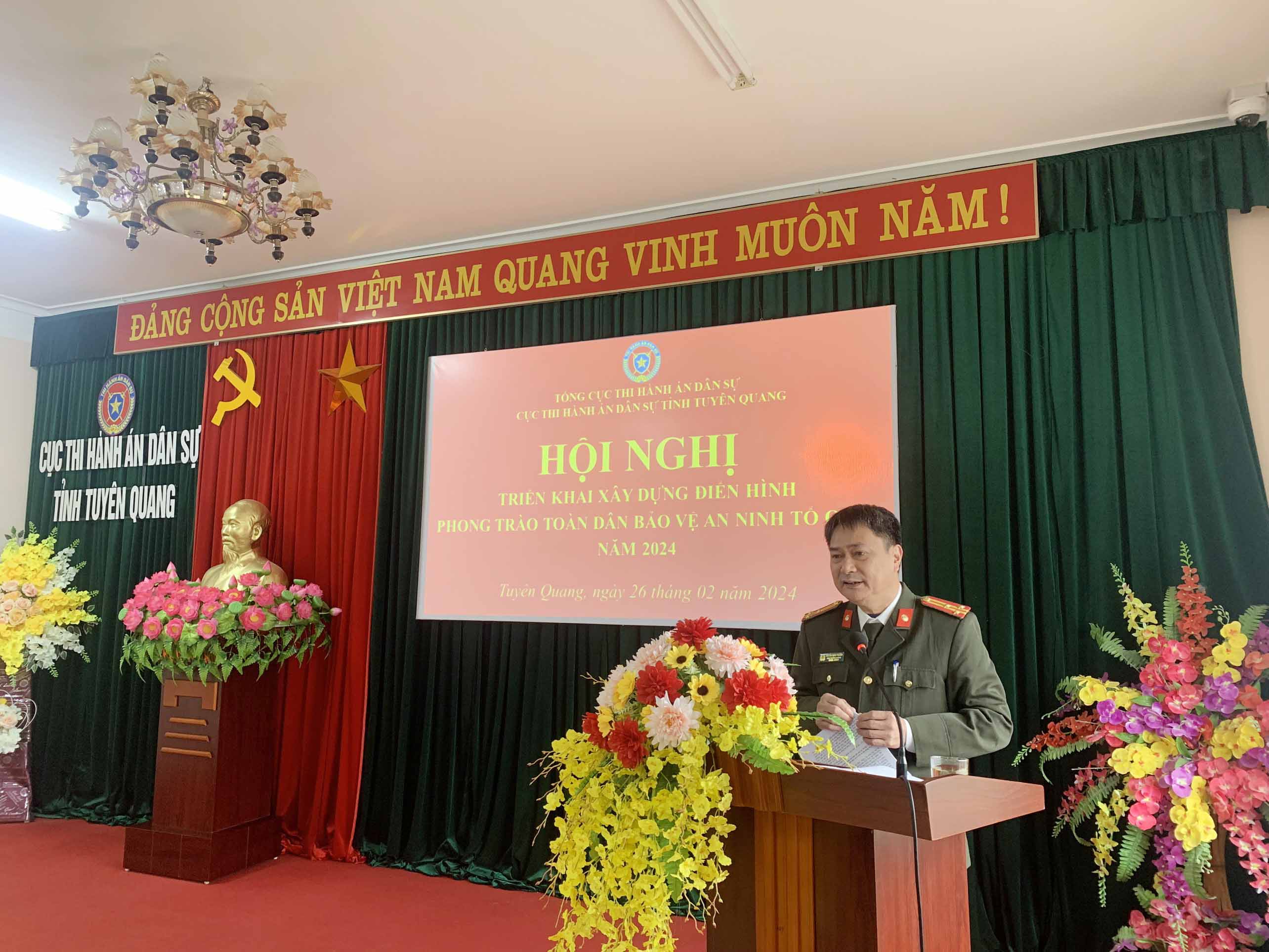 Phát biểu tại Hội nghị, đồng chí Nguyễn Tuyên - Cục trưởng Cục THADS nhấn mạnh: Trong những năm qua, Cấp ủy, lãnh đạo Cục đã quan tâm, chỉ đạo, tổ chức thực hiện nghiêm túc các chỉ thị, nghị quyết của Đảng, pháp luật của Nhà nước về công tác đảm bảo an ninh trật tự; làm tốt công tác đảm bảo an ninh trật tự tại trụ sở cơ quan. Đội ngũ đảng viên, công chức và người lao động THADS luôn có bản lĩnh chính trị, nghề nghiệp vững vàng, có ý thức chấp hành và tuân thủ pháp luật, sẵn sàng nhận và hoàn thành nhiệm vụ được giao. Kết quả tiêu biểu trong năm 2023 thi hành án xong về việc đạt tỷ lệ 88,79%, về tiền đạt 63,29% (vượt 4,79% về việc và vượt 14,79% về tiền so với chỉ tiêu được Tổng cục giao) xếp thứ 8/63 tỉnh, thành về tỷ lệ thi hành xong về việc, thứ 6/63 tỉnh, thành về tỷ lệ thi hành xong về tiền. Giảm án tồn: Về việc giảm 0,3%, về tiền giảm 3,5% so với số chuyển kỳ sau của năm 2022 (Tuyên Quang là một trong số ít tỉnh trong toàn quốc giảm được án chuyển kỳ sau); không có đơn khiếu nại, tố cáo kéo dài phát sinh.Ý thức trách nhiệm của đảng viên, công chức, người lao động trong đấu tranh phòng ngừa tội phạm và đảm bảo an ninh trật tự được nâng lên. Cơ quan luôn bố trí bảo vệ trực cơ quan 24/24 giờ các ngày trong tuần; thường xuyên phối hợp với cơ quan chuyên môn làm tốt công tác bảo chính trị nội bộ, cưỡng chế THA, tổ chức kiểm tra, tập huấn phòng chống cháy nổ, đảm bảo an toàn tuyệt đối trụ sở và kho vật chứng. Triển khai thực hiện mô hình “Cơ quan tự quản về ANTT” có hiệu quả rõ nét.