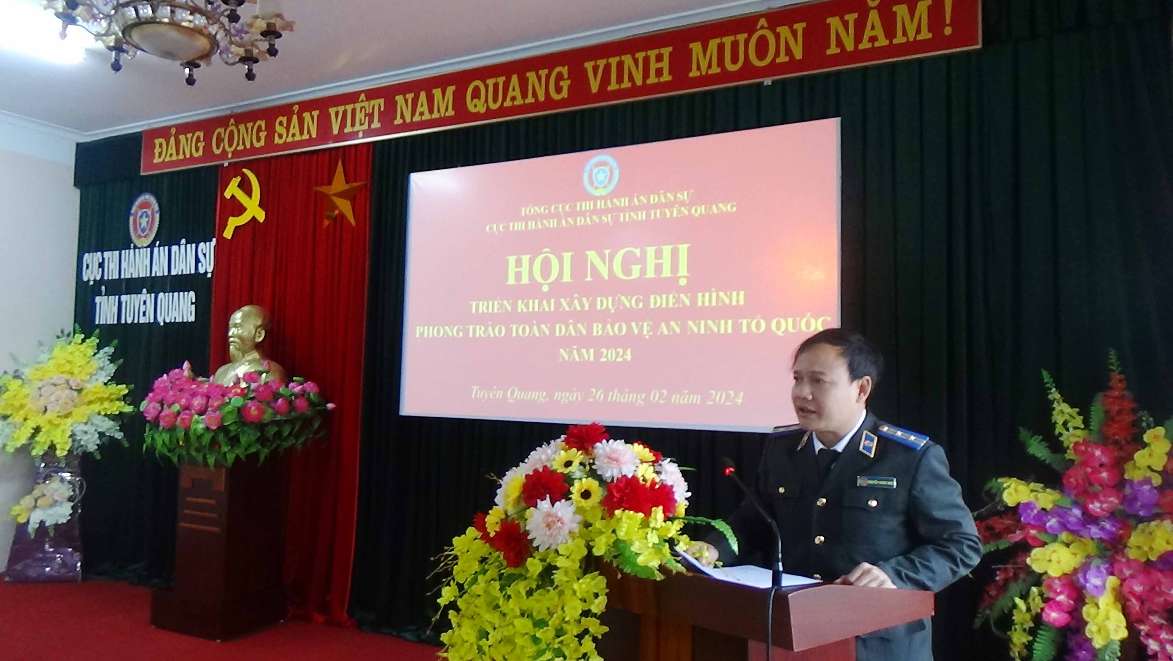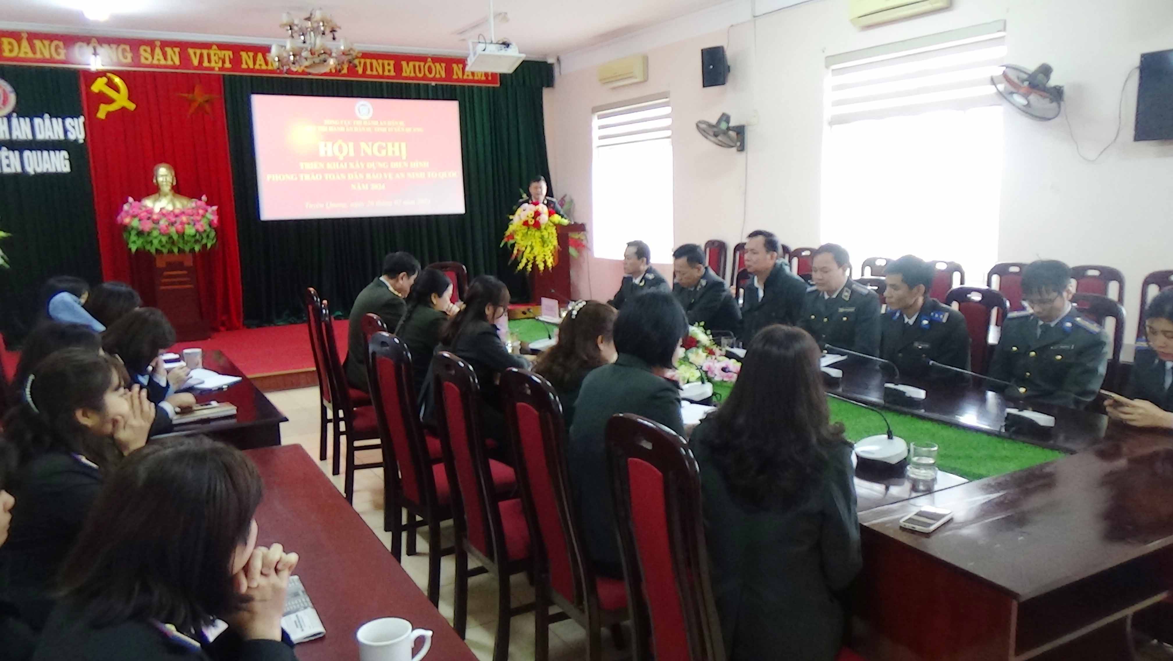 Sáng ngày 26/02/2024, Cục Thi hành án dân sự tỉnh Tuyên Quang tổ chức Hội nghị triển khai xây dựng điển hình phong trào “Toàn dân bảo vệ an ninh Tổ quốc” năm 2024. Đại biểu dự Hội nghị có đại diện Lãnh đạo và cán bộ theo dõi địa bàn của Phòng An ninh chính trị nội bộ - Công an tỉnh Tuyên Quang. Tham dự hội nghị có các đồng chí lãnh đạo Cục, Lãnh đạo các đơn vị thuộc Cục cùng toàn thể công chức, người lao động của Cục. Đồng chí Nguyễn Tuyên - Cục trưởng chủ trì hội nghị.