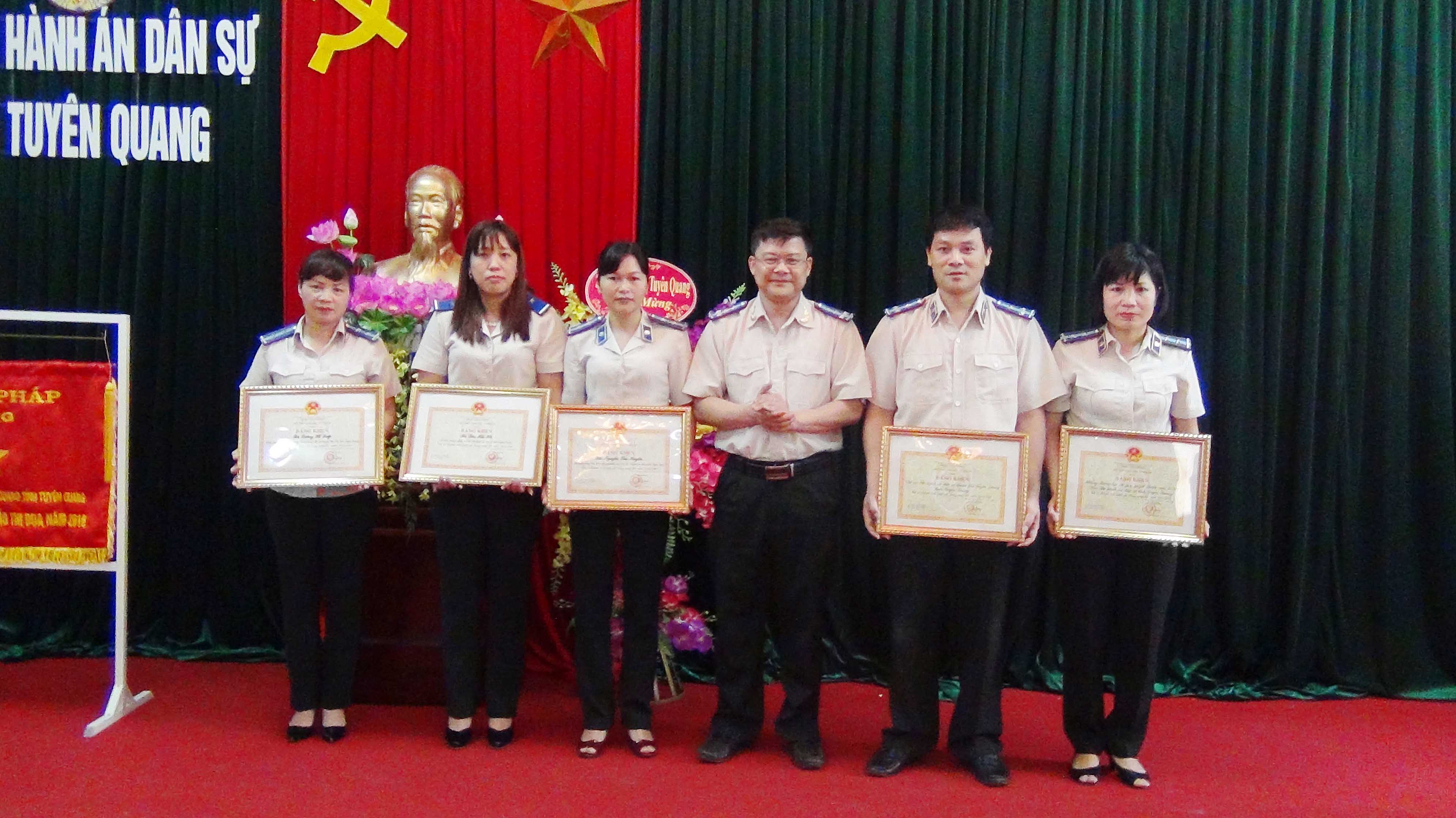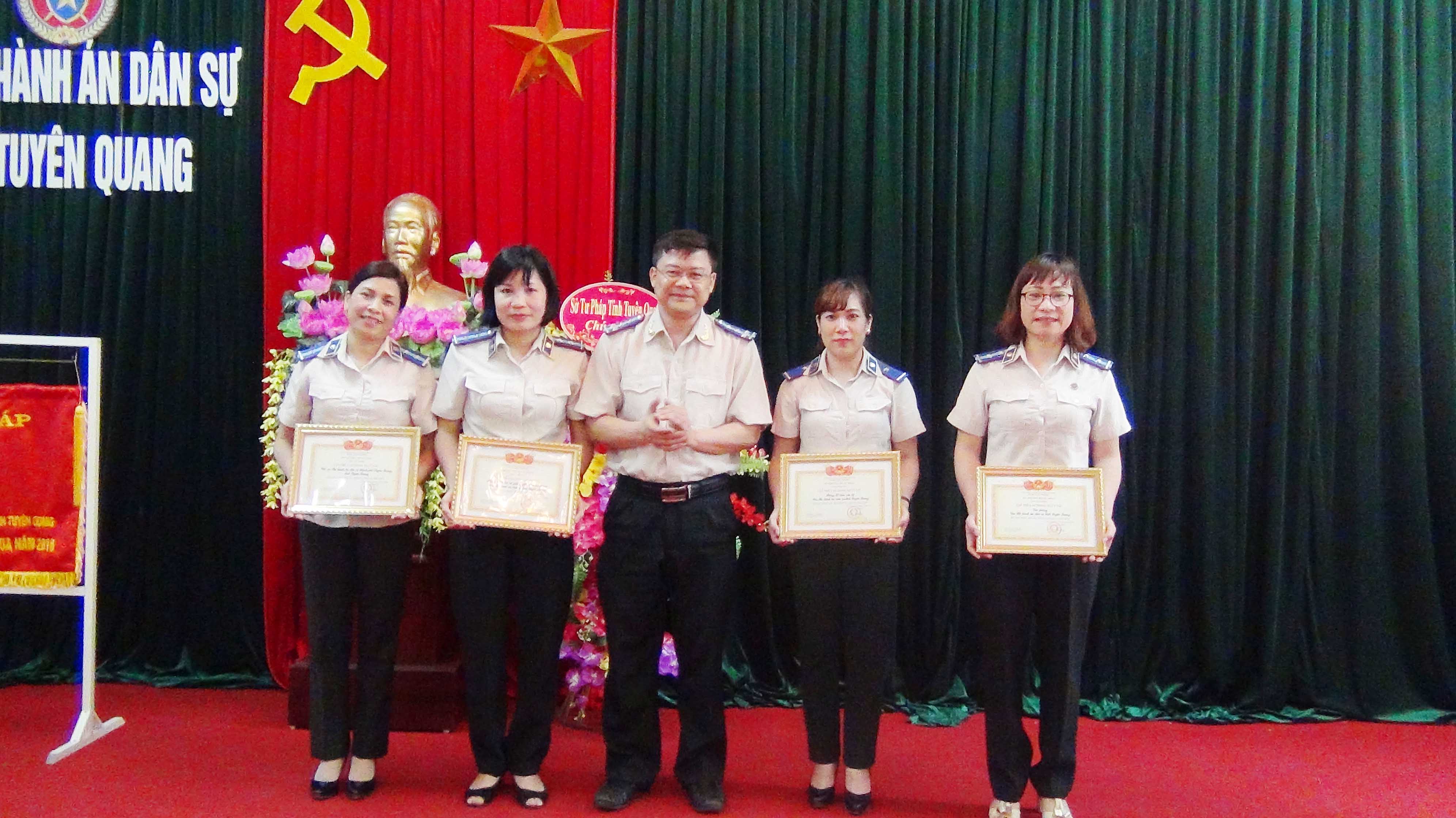 Cũng tại hội nghị, thừa ủy quyền của Bộ Tư pháp, đồng chí Cục trưởng đã trao Cờ thi đua năm 2016 của Bộ Tư pháp cho Chi cục Thi hành án dân sự thành phố Tuyên Quang, trao danh hiệu tập thể Lao động xuất sắc cho 4 đơn vị (Văn phòng Cục, phòng Kiểm tra và giải quyết KNTC, phòng Tổ chức cán bộ, Chi cục THADS thành phố Tuyên Quang) và trao Bằng khen của Bộ trưởng Bộ Tư pháp cho 02 tập thể và 03 cá nhân có thành tích xuất sắc trong công tác năm 2016.