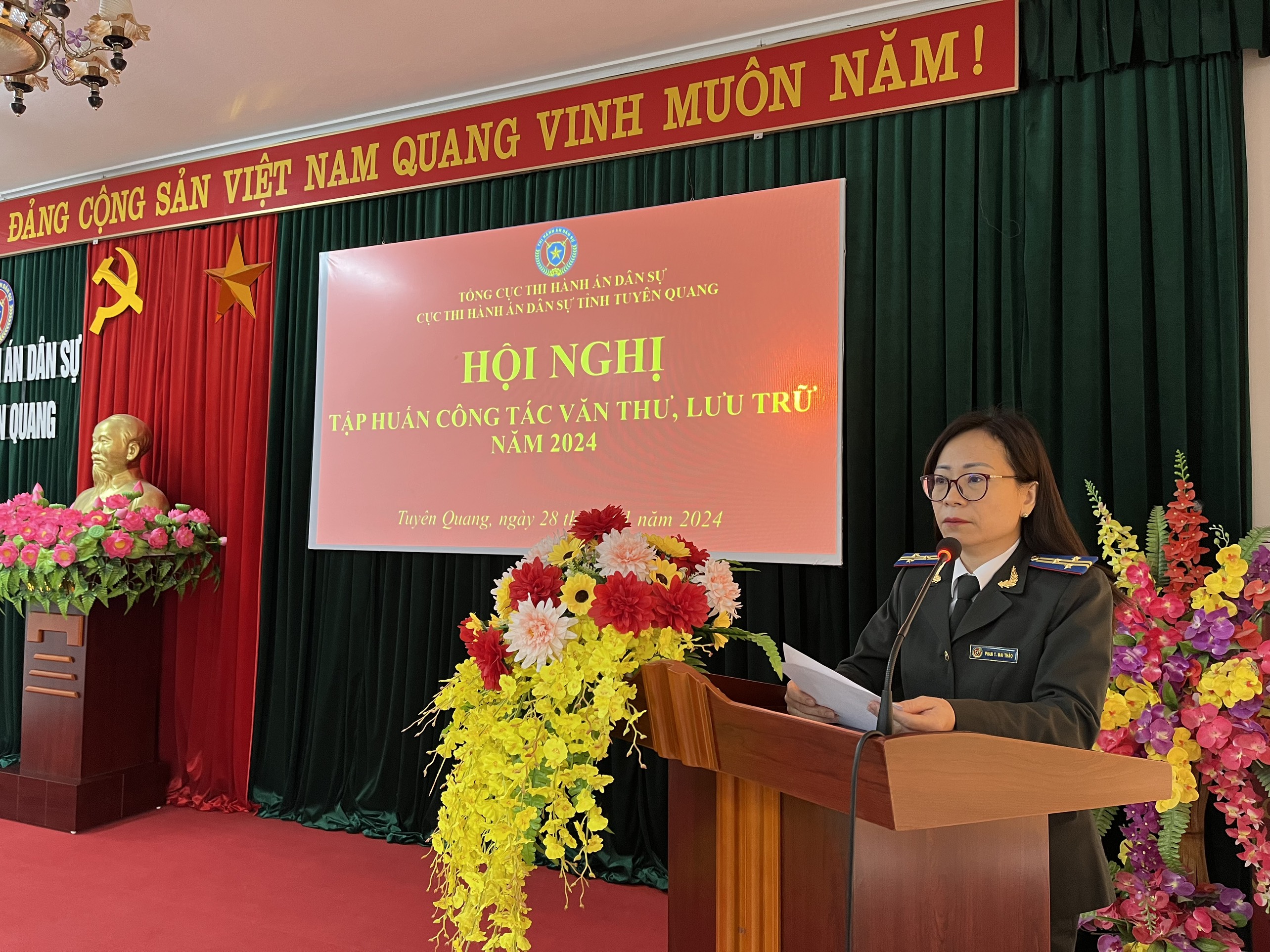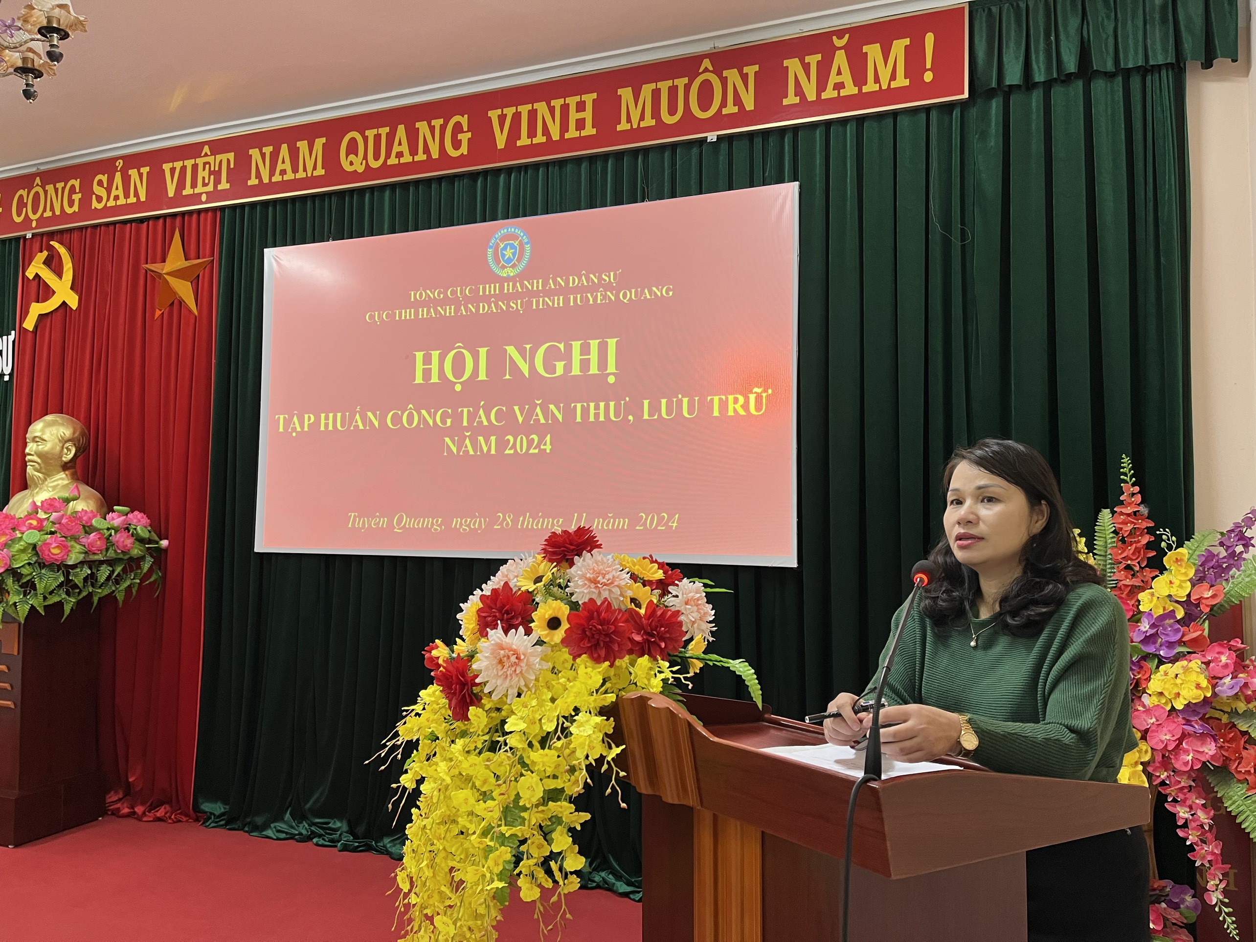 Thực hiện Kế hoạch số 57/KH-CTHADS ngày 11/11/2024 của Cục Thi hành án dân sự tỉnh Tuyên Quang về kế hoạch tập huấn công tác văn thư lưu trữ năm 2024. Sáng ngày 28 tháng 11 năm 2024, Cục Thi hành án dân sự tỉnh Tuyên Quang đã tổ chức Hội nghị tập huấn công tác văn thư, lưu trữ năm 2024 cho Lãnh đạo, công chức thuộc Cục và Lãnh đạo, công chức làm công tác văn thư, lưu trữ của Chi cục Thi hành án dân sự các huyện, thành phố.