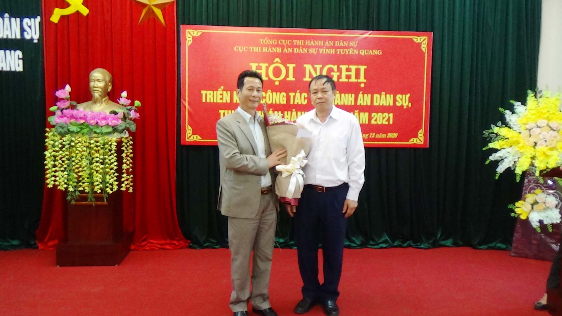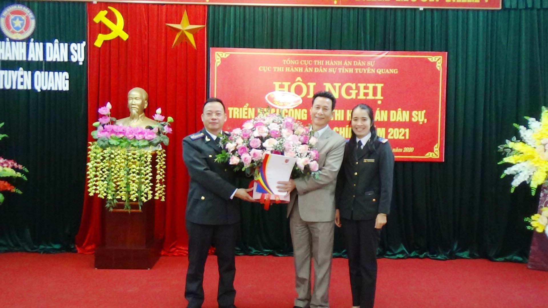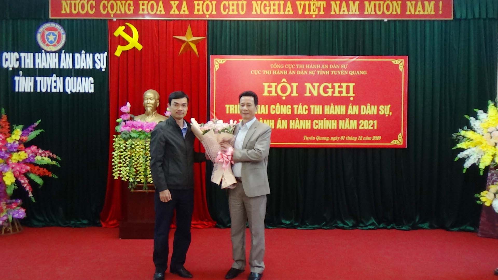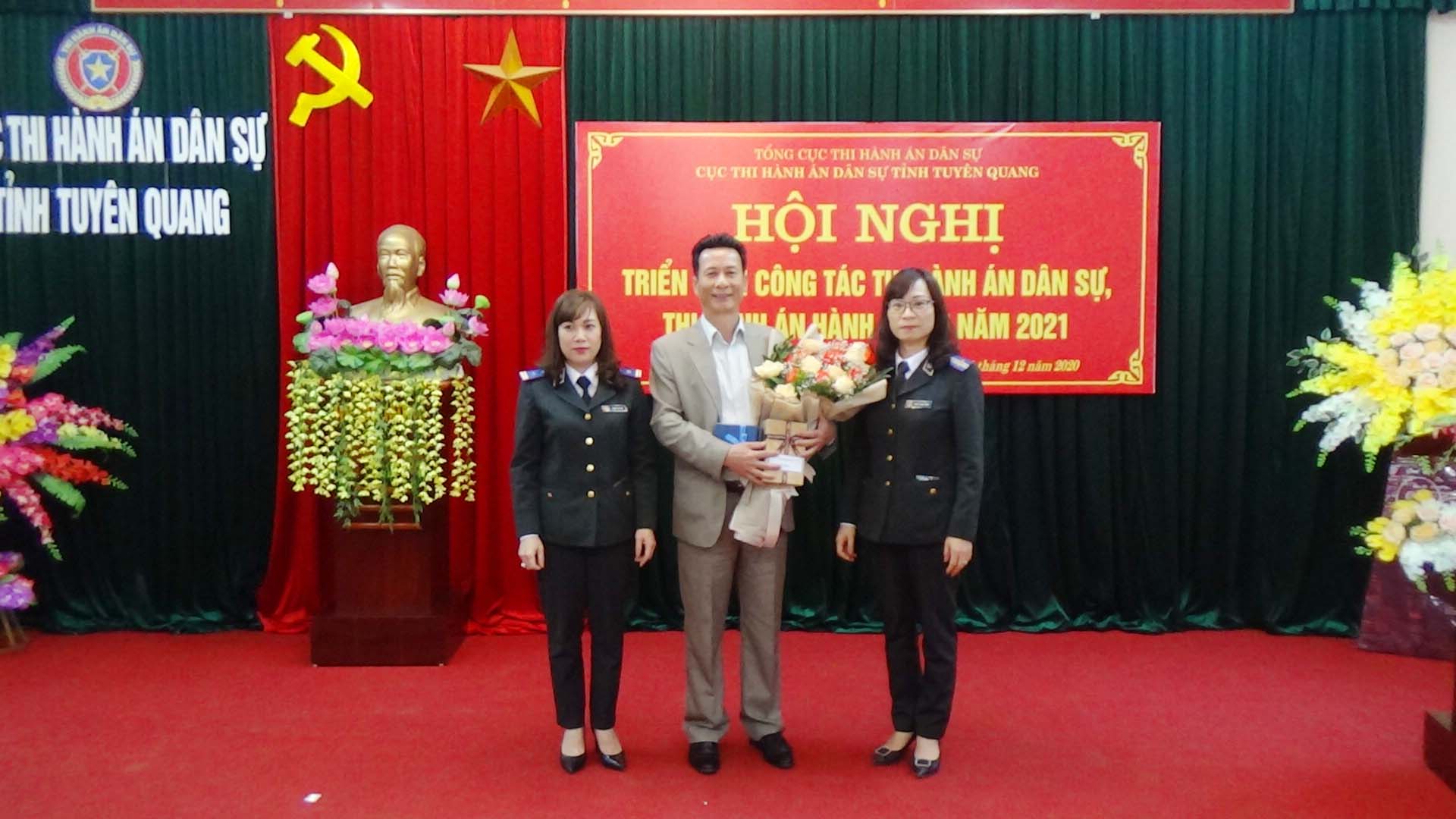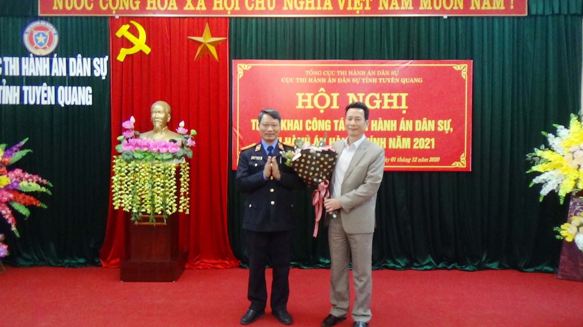 Ngày 01/12/2020, Cục Thi hành án dân sự tỉnh Tuyên Quang đã tổ chức Hội nghị tổng kết công tác thi hành án dân sự, thi hành án hành chính năm 2020, triển khai nhiệm vụ công tác năm 2021. Dự và chỉ đạo hội nghị có đồng chí Nguyễn Văn Sơn, Phó Bí thư Tỉnh ủy, Chủ tịch UBND tỉnh, Trưởng Ban thi hành án dân sự tỉnh; đồng chí Nguyễn Quang Thái, Uỷ viên BCS Đảng Bộ Tư pháp, Tổng cục trưởng Tổng cục Thi hành án dân sự. Tham dự Hội nghị còn có lãnh đạo Ban Nội chính Tỉnh ủy, Văn phòng UBND tỉnh, Đảng ủy khối các cơ quan và doanh nghiệp tỉnh; lãnh đạo các đơn vị trong khối nội chính tỉnh (Công an, Tòa án, Viện Kiểm sát) và các cơ quan phối hợp trong công tác thi hành án dân sự (Sở Tư pháp, BHXH tỉnh, Ngân hàng Nhà nước tỉnh, Trại giam Quyết Tiến, Trại tạm giam Công an tỉnh); toàn thể lãnh đạo, chấp hành viên, thẩm tra viên, thư ký thi hành án, kế toán trưởng HCSN, kế toán trưởng nghiệp vụ của Cục và các Chi cục trực thuộc.