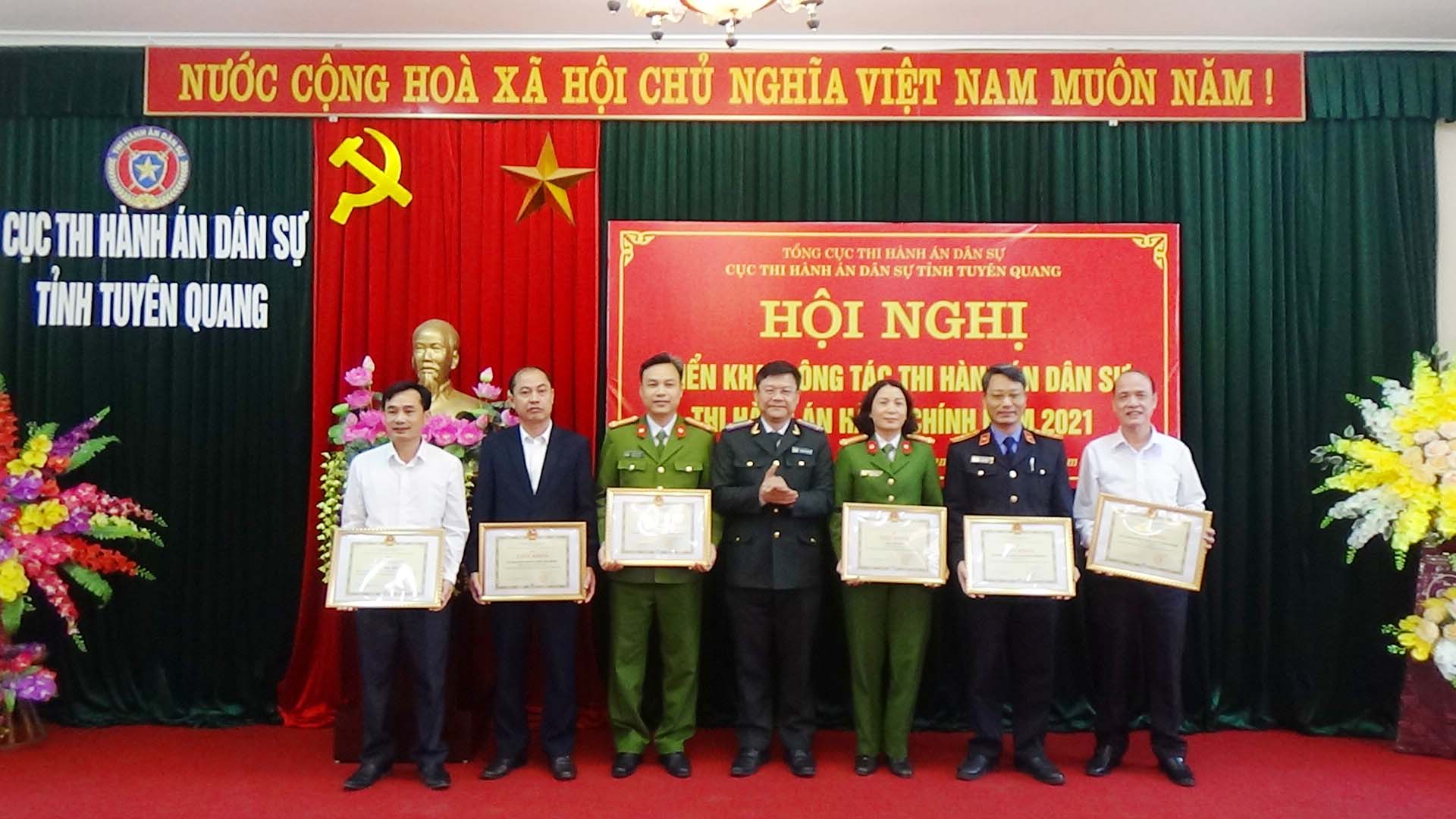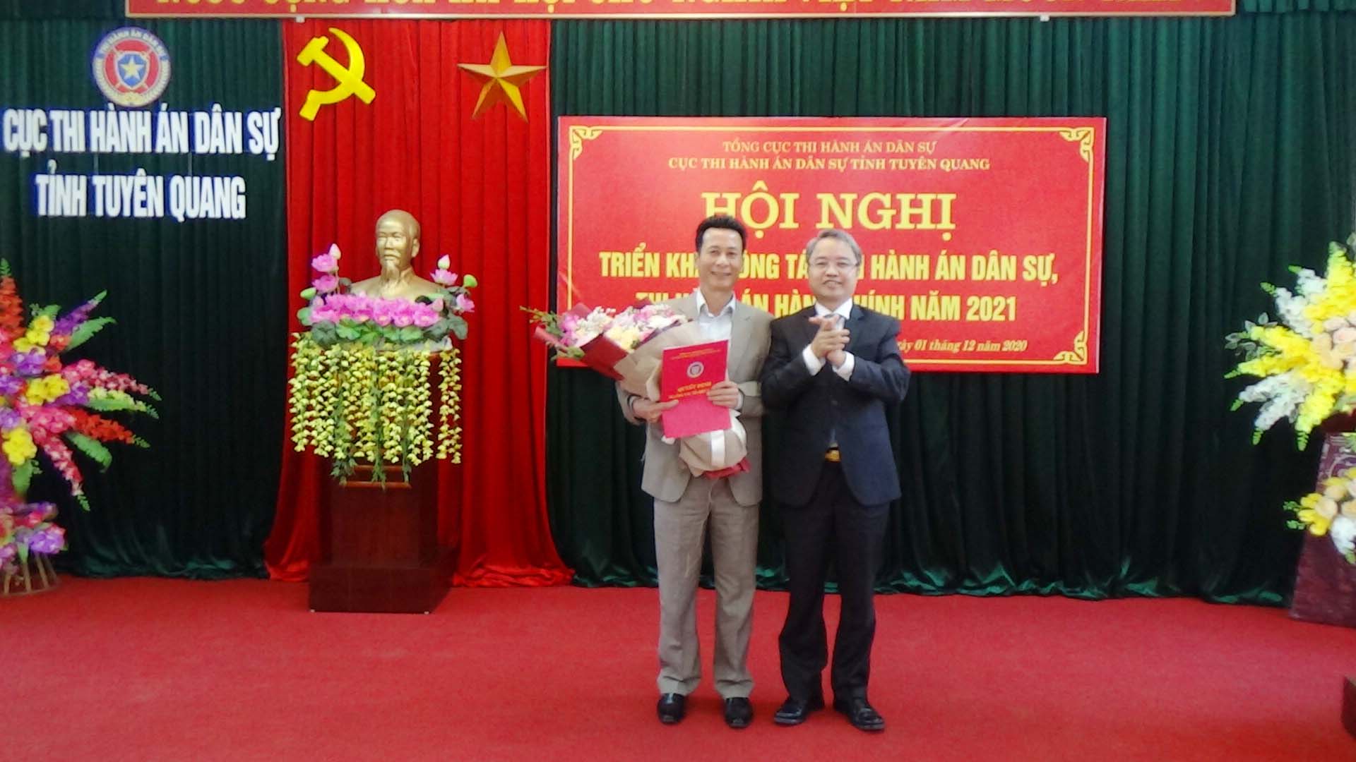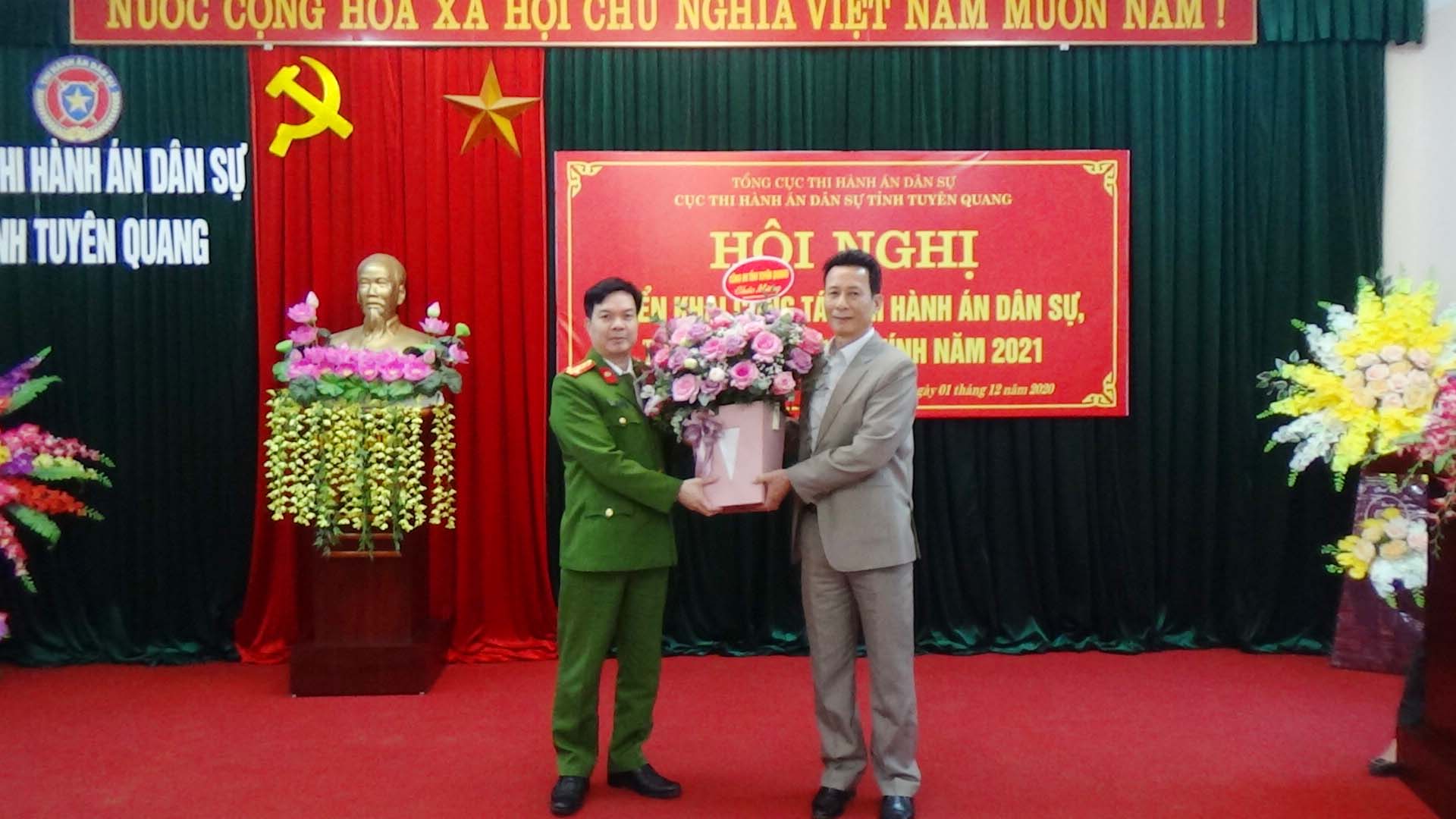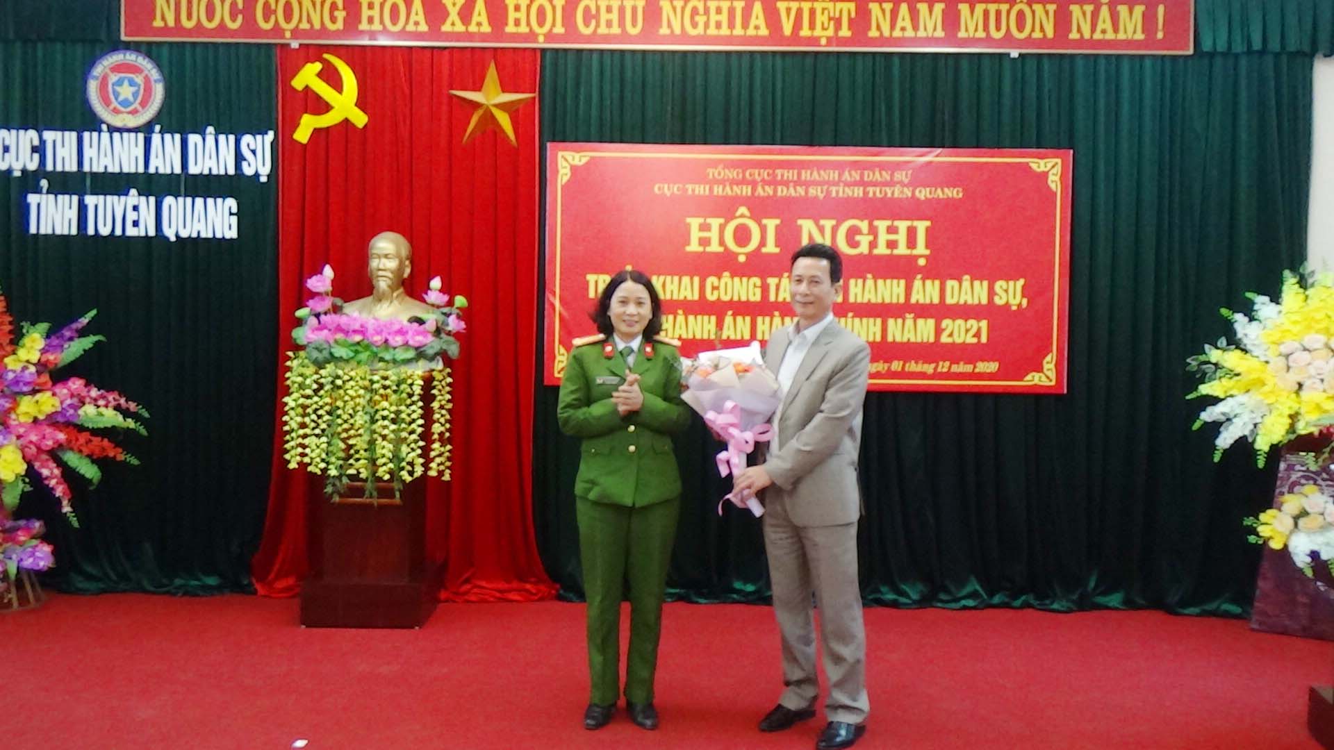 Ngày 01/12/2020, Cục Thi hành án dân sự tỉnh Tuyên Quang đã tổ chức Hội nghị tổng kết công tác thi hành án dân sự, thi hành án hành chính năm 2020, triển khai nhiệm vụ công tác năm 2021. Dự và chỉ đạo hội nghị có đồng chí Nguyễn Văn Sơn, Phó Bí thư Tỉnh ủy, Chủ tịch UBND tỉnh, Trưởng Ban thi hành án dân sự tỉnh; đồng chí Nguyễn Quang Thái, Uỷ viên BCS Đảng Bộ Tư pháp, Tổng cục trưởng Tổng cục Thi hành án dân sự. Tham dự Hội nghị còn có lãnh đạo Ban Nội chính Tỉnh ủy, Văn phòng UBND tỉnh, Đảng ủy khối các cơ quan và doanh nghiệp tỉnh; lãnh đạo các đơn vị trong khối nội chính tỉnh (Công an, Tòa án, Viện Kiểm sát) và các cơ quan phối hợp trong công tác thi hành án dân sự (Sở Tư pháp, BHXH tỉnh, Ngân hàng Nhà nước tỉnh, Trại giam Quyết Tiến, Trại tạm giam Công an tỉnh); toàn thể lãnh đạo, chấp hành viên, thẩm tra viên, thư ký thi hành án, kế toán trưởng HCSN, kế toán trưởng nghiệp vụ của Cục và các Chi cục trực thuộc.