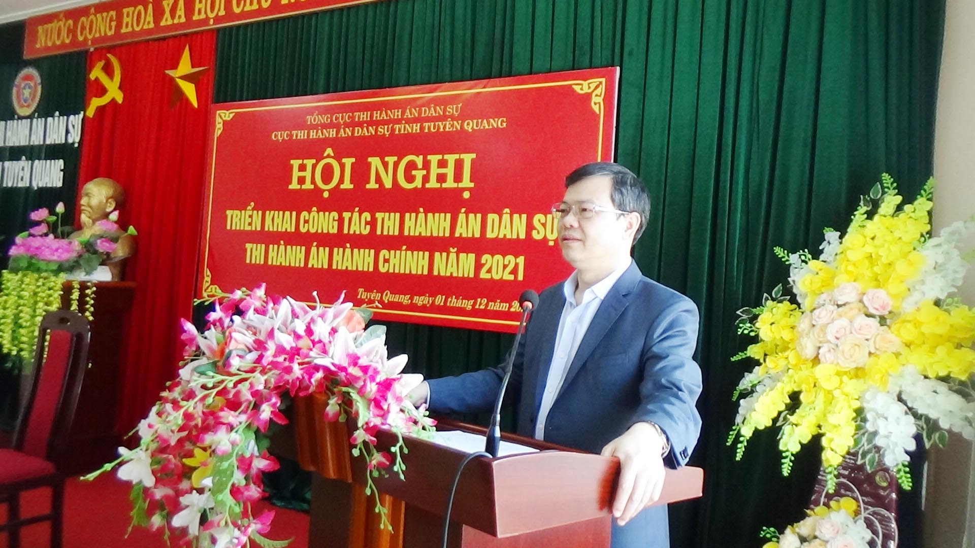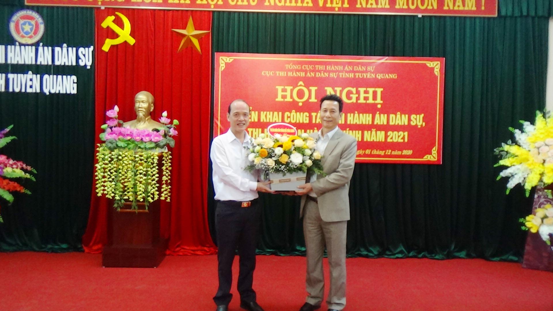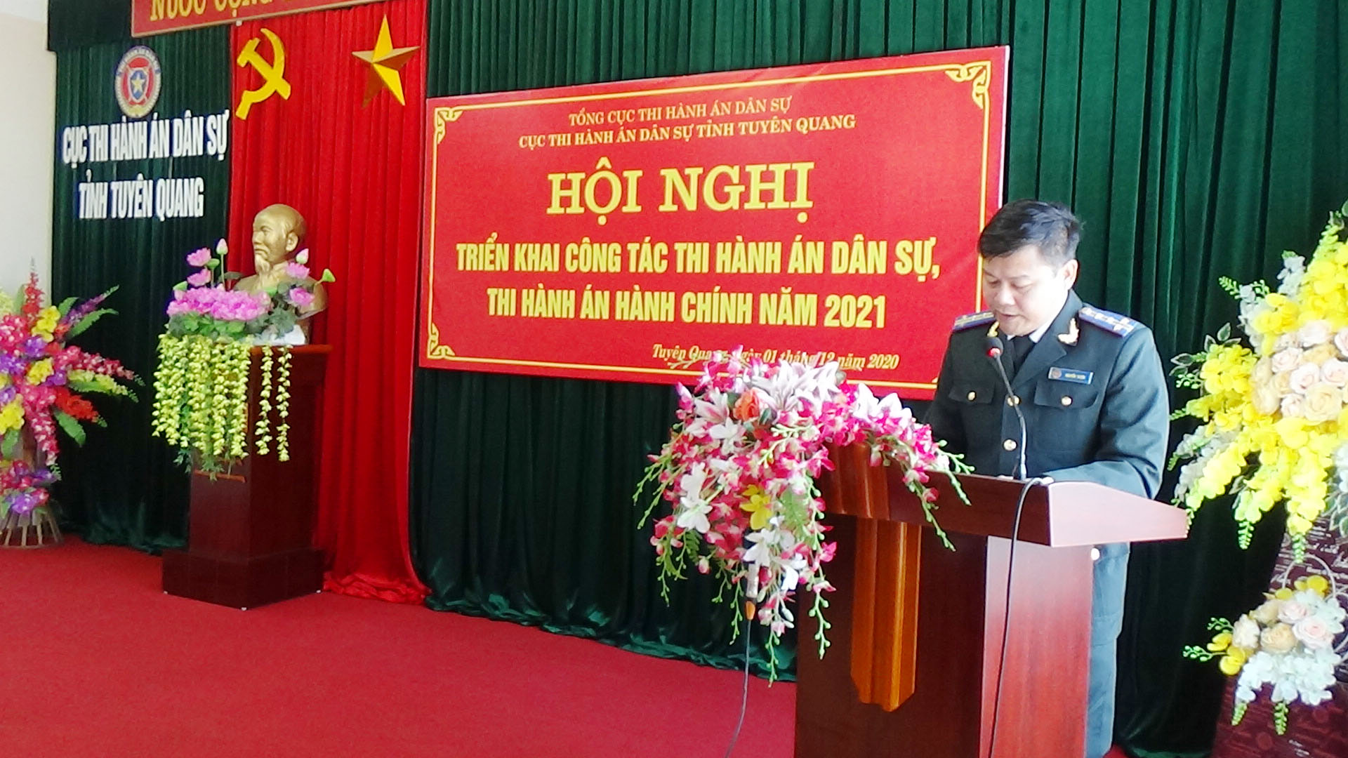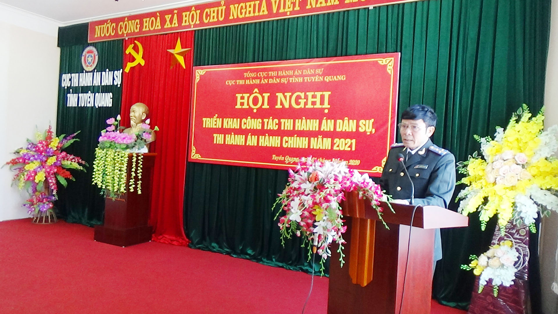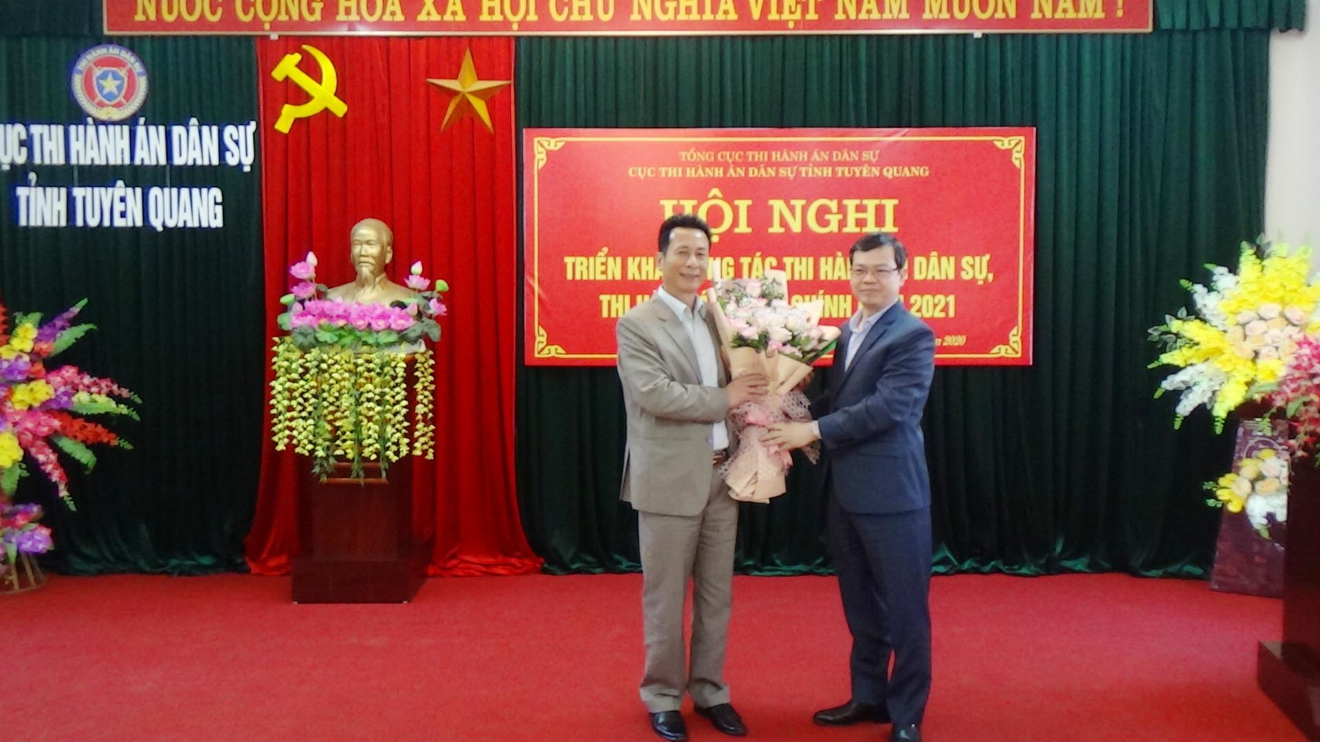 Ngày 01/12/2020, Cục Thi hành án dân sự tỉnh Tuyên Quang đã tổ chức Hội nghị tổng kết công tác thi hành án dân sự, thi hành án hành chính năm 2020, triển khai nhiệm vụ công tác năm 2021. Dự và chỉ đạo hội nghị có đồng chí Nguyễn Văn Sơn, Phó Bí thư Tỉnh ủy, Chủ tịch UBND tỉnh, Trưởng Ban thi hành án dân sự tỉnh; đồng chí Nguyễn Quang Thái, Uỷ viên BCS Đảng Bộ Tư pháp, Tổng cục trưởng Tổng cục Thi hành án dân sự. Tham dự Hội nghị còn có lãnh đạo Ban Nội chính Tỉnh ủy, Văn phòng UBND tỉnh, Đảng ủy khối các cơ quan và doanh nghiệp tỉnh; lãnh đạo các đơn vị trong khối nội chính tỉnh (Công an, Tòa án, Viện Kiểm sát) và các cơ quan phối hợp trong công tác thi hành án dân sự (Sở Tư pháp, BHXH tỉnh, Ngân hàng Nhà nước tỉnh, Trại giam Quyết Tiến, Trại tạm giam Công an tỉnh); toàn thể lãnh đạo, chấp hành viên, thẩm tra viên, thư ký thi hành án, kế toán trưởng HCSN, kế toán trưởng nghiệp vụ của Cục và các Chi cục trực thuộc.