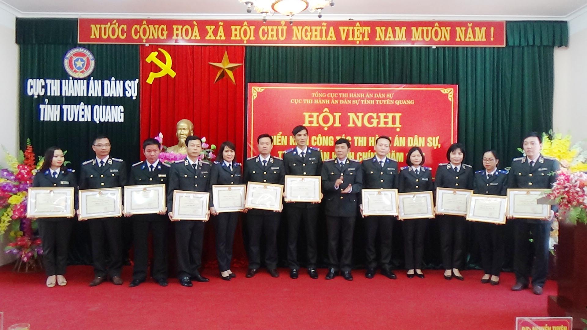 Tại Hội nghị, Cục Thi hành án dân sự tỉnh công bố các quyết định và trao tặng Giấy khen cho 6 tập thể hoàn thành xuất sắc nhiệm vụ công tác năm 2020; danh hiệu "Chiến sỹ thi đua cơ sở" cho 16 cá nhân trong các cơ quan THADS của tỉnh; trao tặng giấy khen cho 4 tập thể, 2 cá nhân có thành tích xuất sắc, tiêu biểu trong phối hợp thực hiện công tác thi hành án dân sự trên địa bàn tỉnh.