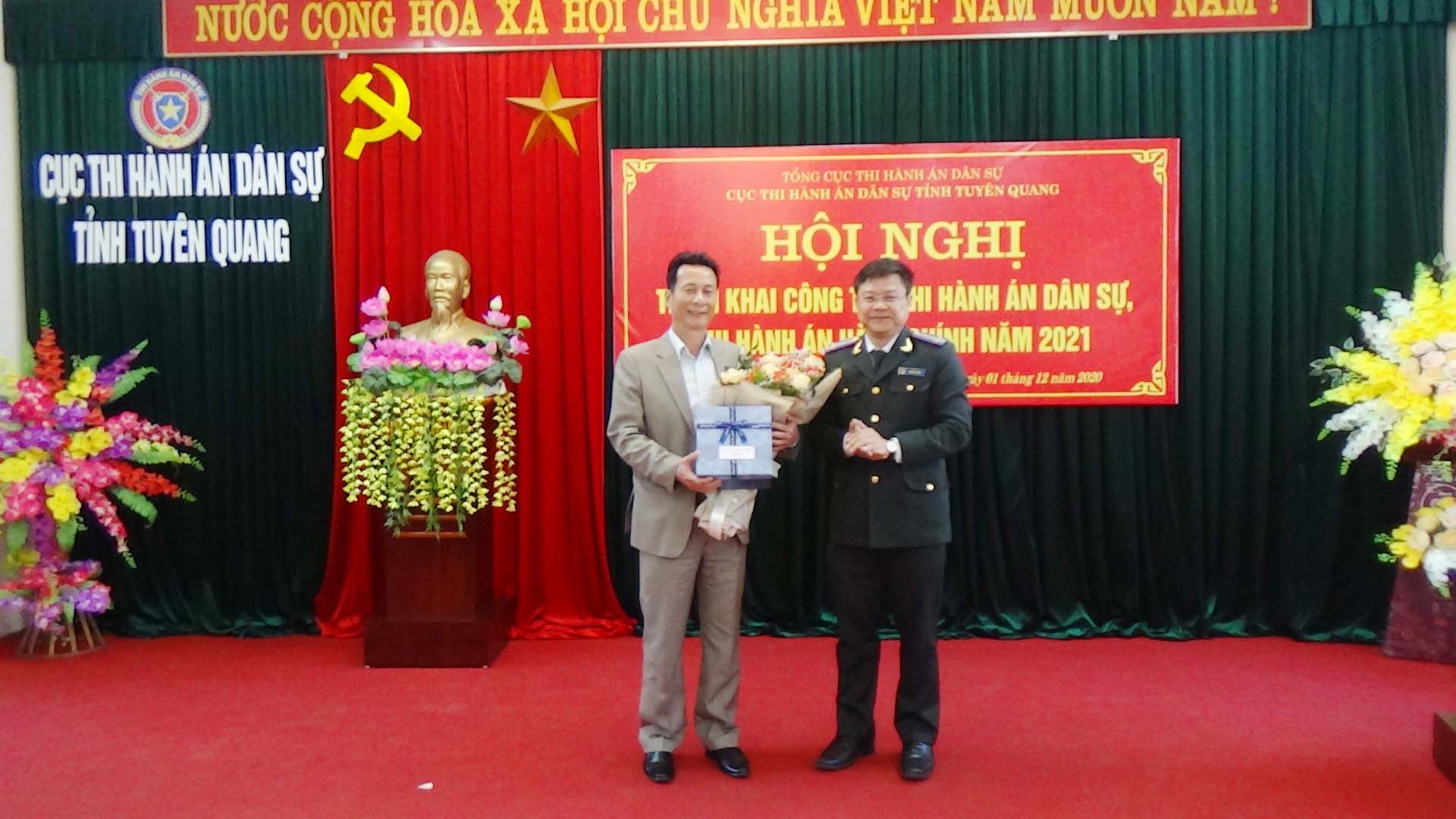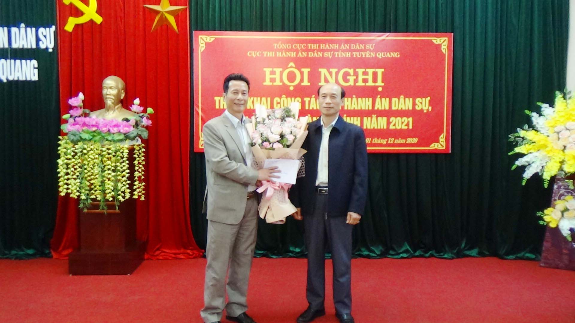 Nhân dịp này, hội nghị đã công bố và trao quyết định của Tổng Cục trưởng Tổng Cục thi hành án dân sự về nghỉ hưu hưởng chế độ bảo hiểm đối với đồng chí Hứa Đức Hạnh, Phó Cục trưởng Cục Thi hành án dân sự tỉnh Tuyên Quang (nghỉ chế độ từ ngày 01/12/2020).