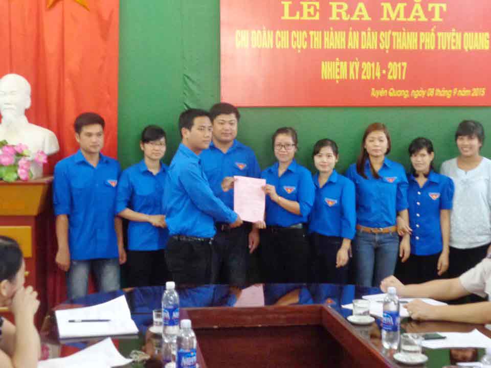 Thực hiện Quyết định số 215-QĐ-ĐTN ngày 7/9/2015 của Ban Thường vụ Thành đoàn Tuyên Quang về việc thành lập Chi đoàn Chi cục thi hành án dân sự thành phố Tuyên Quang, chiều ngày 8/9/2015, tại Hội trường trụ sở Chi cục thi hành án dân sự thành phố Tuyên Quang đã long trọng tổ chức “Lễ Công bố Quyết định thành lập Chi đoàn và ra mắt Ban chấp hành Chi đoàn lâm thời”