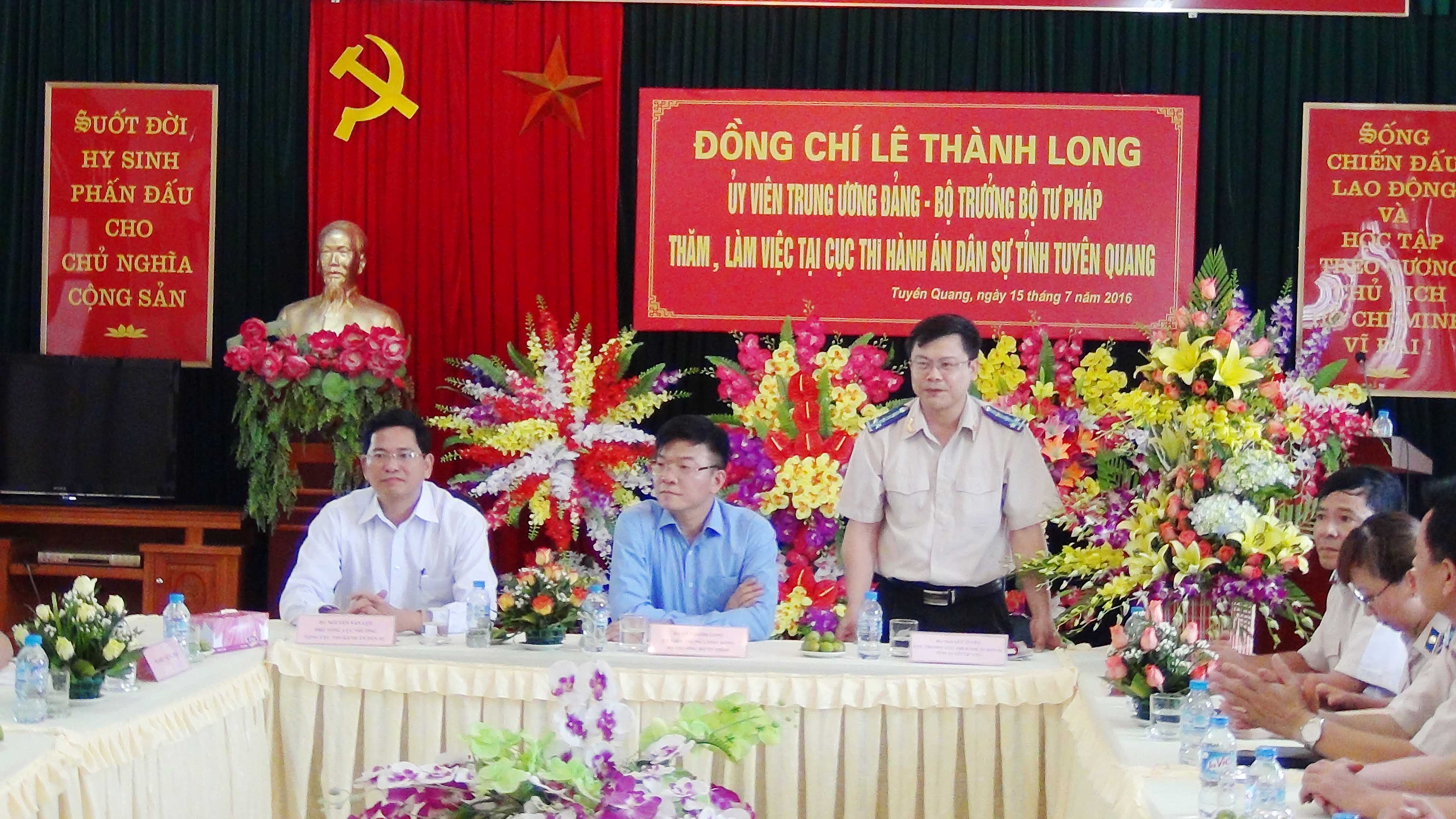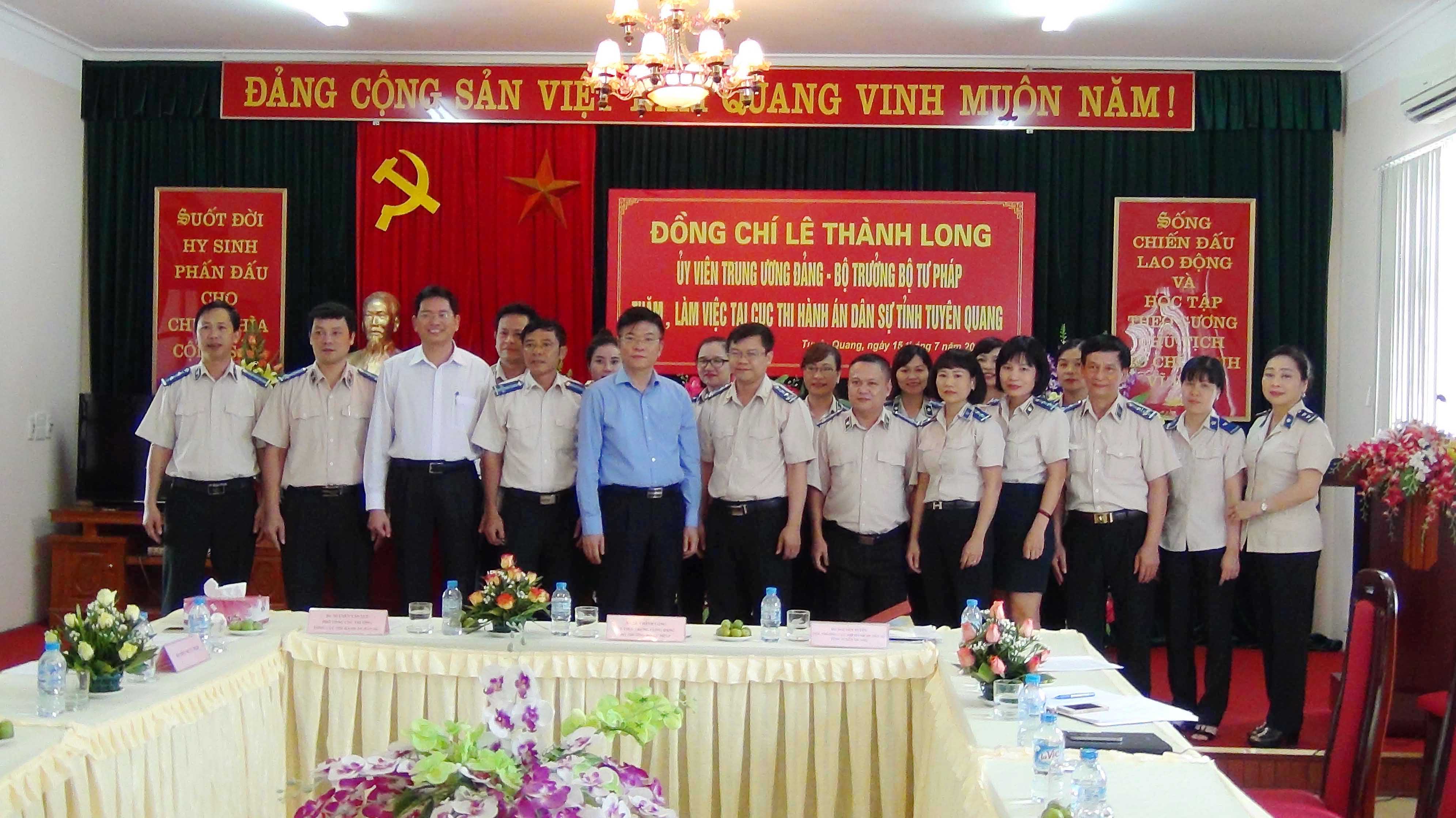 Sáng ngày 15/7/2016, sau khi làm việc với lãnh đạo Tỉnh ủy, HĐND, UBND tỉnh, Đoàn công tác của Bộ Tư pháp do đồng chí Lê Thành Long, Ủy viên BCH Trung ương Đảng, Bộ trưởng Bộ Tư pháp đã thăm và làm việc tại Cục Thi hành án dân sự tỉnh Tuyên Quang. Cùng dự buổi làm việc có đồng chí Nguyễn Văn Lực, Phó Tổng cục trưởng Tổng cục THADS; đại diện lãnh đạo các đơn vị thuộc Bộ: Vụ Tổ chức cán bộ; Vụ Kế hoạch- Tài chính; Vụ Phổ biến, giáo dục pháp luật; Cục Hộ tịch, quốc tịch, chứng thực; Cục Kiểm soát thủ tục hành chính; Cục Bổ trợ tư pháp; Cục trợ giúp pháp lý; Học viện Tư pháp. Về phía Cục THADS tỉnh Tuyên Quang có đồng chí Nguyễn Tuyên - Cục trưởng, đồng chí Nguyễn Văn Quế - Phó Cục trưởng, lãnh đạo các phòng chuyên môn, lãnh đạo Chi cục Thi hành án dân sự thành phố Tuyên Quang, cùng toàn thể cán bộ, công chức, người lao động Cục Thi hành án dân sự tỉnh.