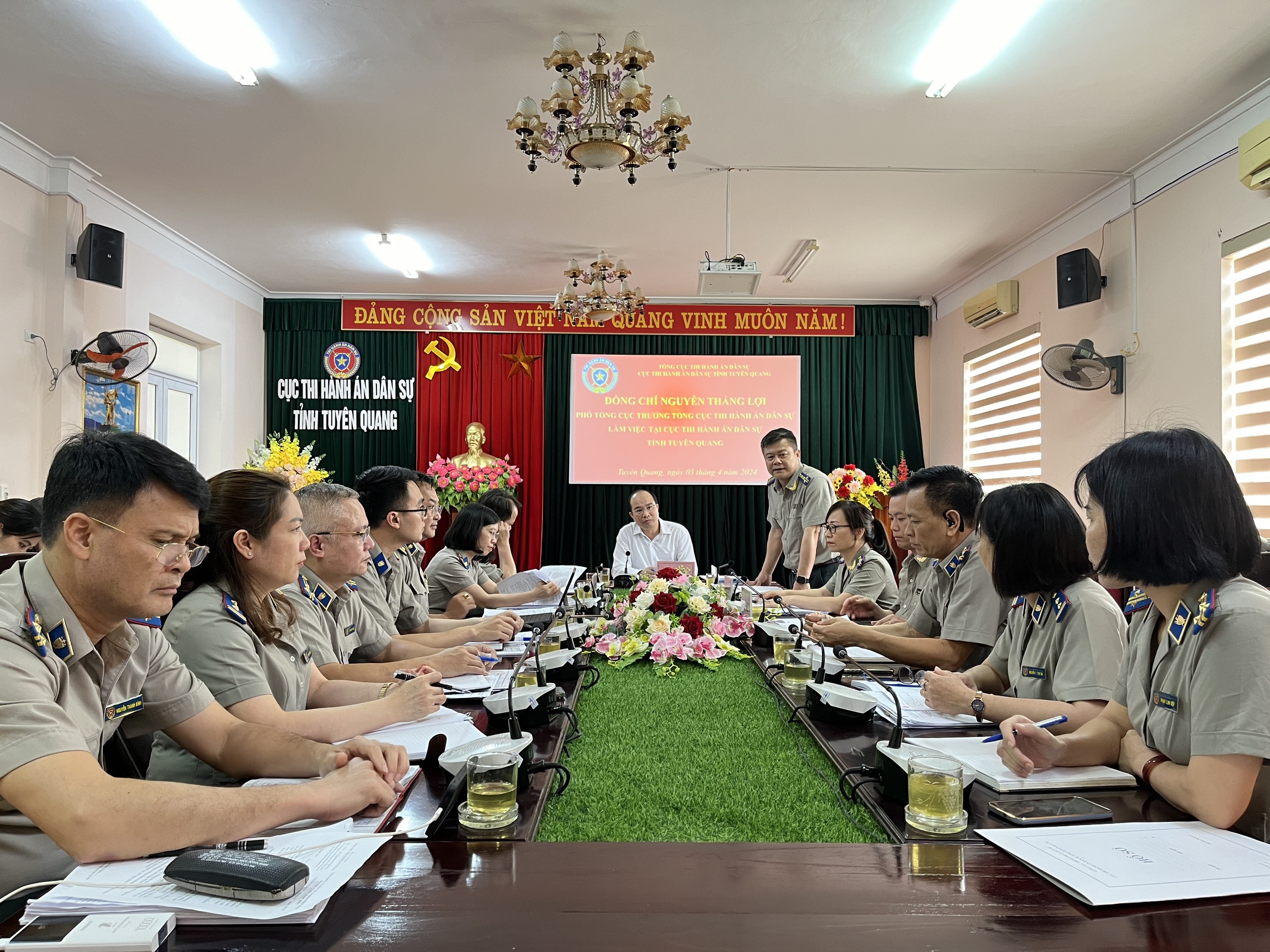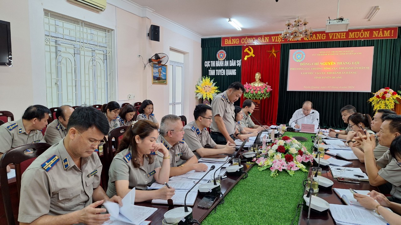 Ngày 03/4/2024, tại trụ sở Cục Thi hành án dân sự (THADS) tỉnh Tuyên Quang, đồng chí Nguyễn Thắng Lợi, Phó Tổng Cục trưởng đã có buổi làm việc về tình hình thực hiện chỉ tiêu, nhiệm vụ công tác THADS, THAHC 05 tháng đầu năm và kết quả thực hiện Công văn số 693-CV/BCSĐ ngày 11/01/2024 của Ban cán sự đảng Bộ Tư pháp về việc lãnh đạo, chỉ đạo nâng cao hiệu quả công tác THADS tại tỉnh Tuyên Quang. Tham dự buổi làm việc có lãnh đạo Vụ Giải quyết khiếu nại tố cáo, Vụ Nghiệp vụ 1, Vụ Nghiệp vụ 3 – Tổng cục THADS, tập thể lãnh đạo Cục THADS tỉnh Tuyên Quang, lãnh đạo các Phòng chuyên môn và tương đương thuộc Cục và Lãnh đạo các Chi cục THADS trực thuộc.
