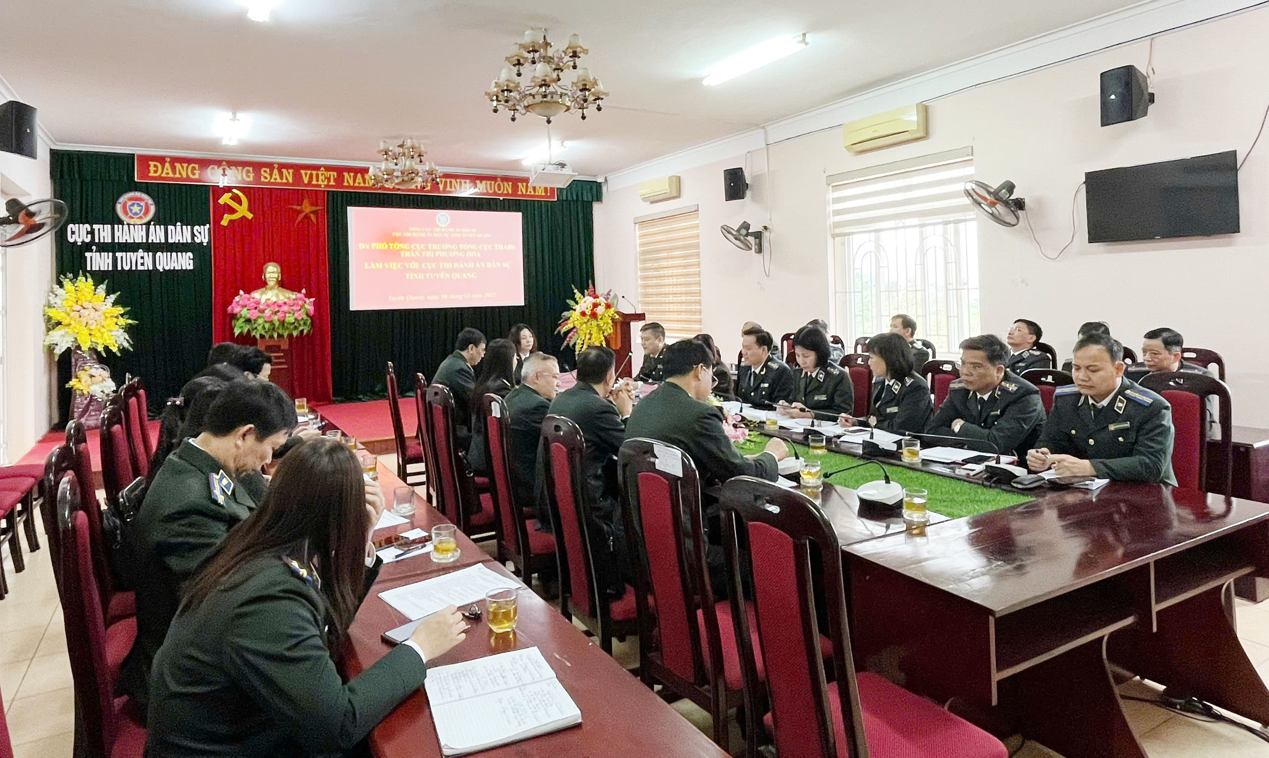 Ngày 06/3/2025, tại trụ sở Cục Thi hành án dân sự (THADS) tỉnh Tuyên Quang, đồng chí Trần Thị Phương Hoa, Phó Tổng Cục trưởng Tổng cục THADS đã có buổi làm việc về kết quả thực hiện chỉ tiêu, nhiệm vụ công tác THADS, THAHC 05 tháng đầu năm 2025 và tình hình thực hiện Nghị quyết 18-NQ/TW ngày 25/10/2017 của Ban Chấp hành Trung ương khoá XII về tiếp tục đổi mới, sắp xếp tổ chức bộ máy của hệ thống chính trị tinh gọn, hoạt động hiệu lực, hiệu quả. Tham dự buổi làm việc có đồng chí Phạm Thành Trung, Phó Vụ trưởng Vụ Tổ chức cán bộ – Tổng cục THADS, tập thể lãnh đạo Cục THADS tỉnh Tuyên Quang, lãnh đạo các Phòng chuyên môn và tương đương thuộc Cục và Lãnh đạo các Chi cục THADS huyện, thành phố của tỉnh.